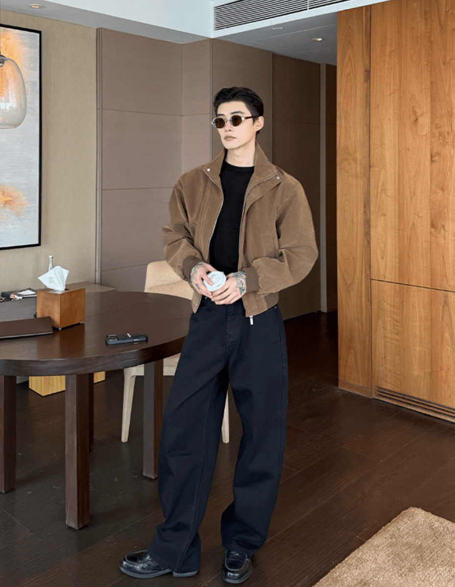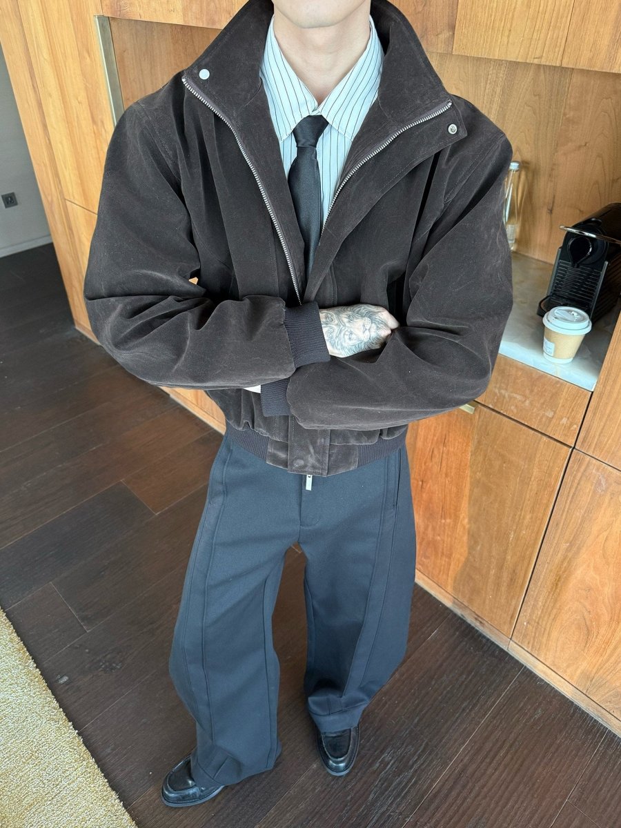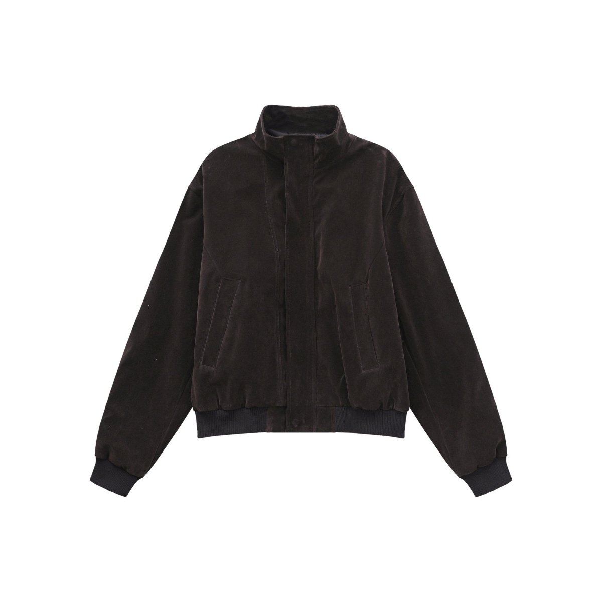 落ち着いた霧面(マット)素材が印象的な、ヴィンテージムード漂うショート丈ブルゾン。無駄を削ぎ落とした翻領デザインと、短めの着丈×ワイドな廓形シルエットが、今の空気感をさりげなく取り入れた一着です。
