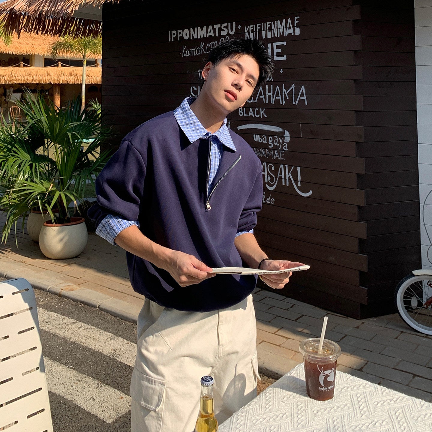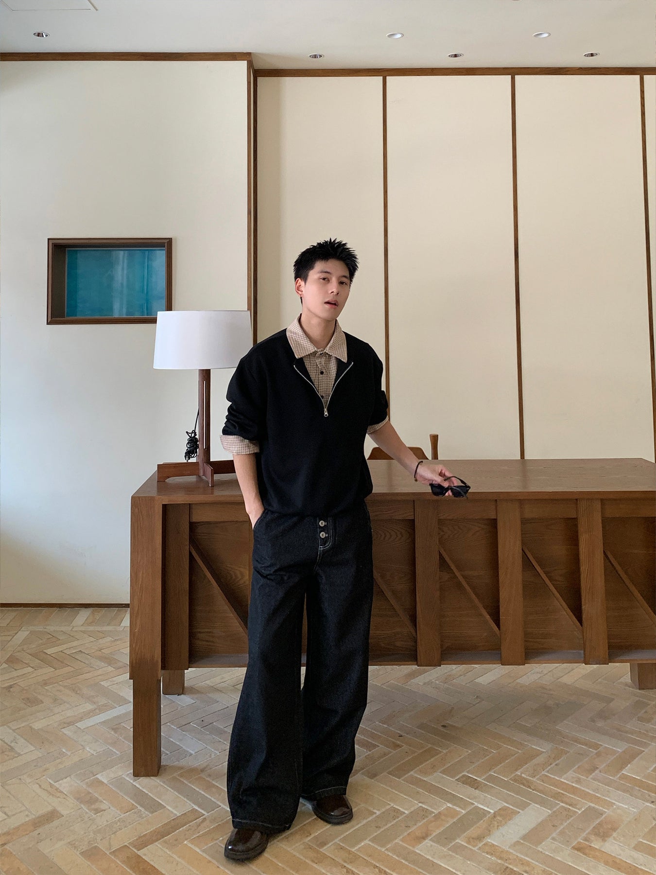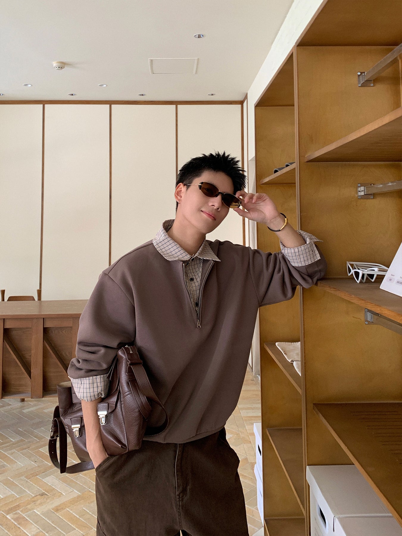 一枚で完成する“clean fit”スタイル。シャツを重ねたように見せるフェイクレイヤード仕様の、ハーフジップPOLOスウェットです。襟元から覗くチェック柄がさりげないアクセントとなり、カジュアルでありながらもどこか知的な印象を演出。アメリカンカジュアルの空気感を、今の都会的バランスで再構築しました。