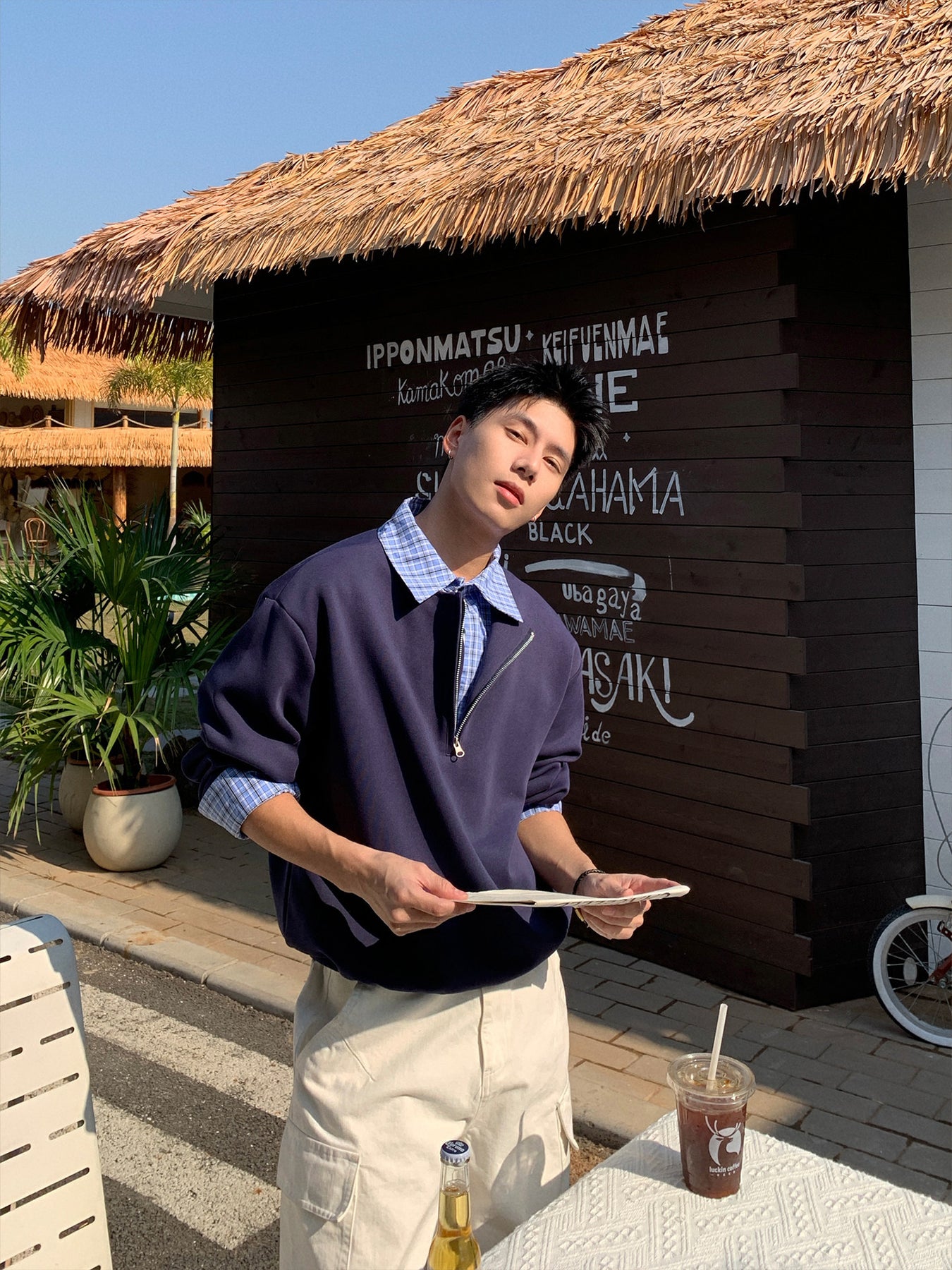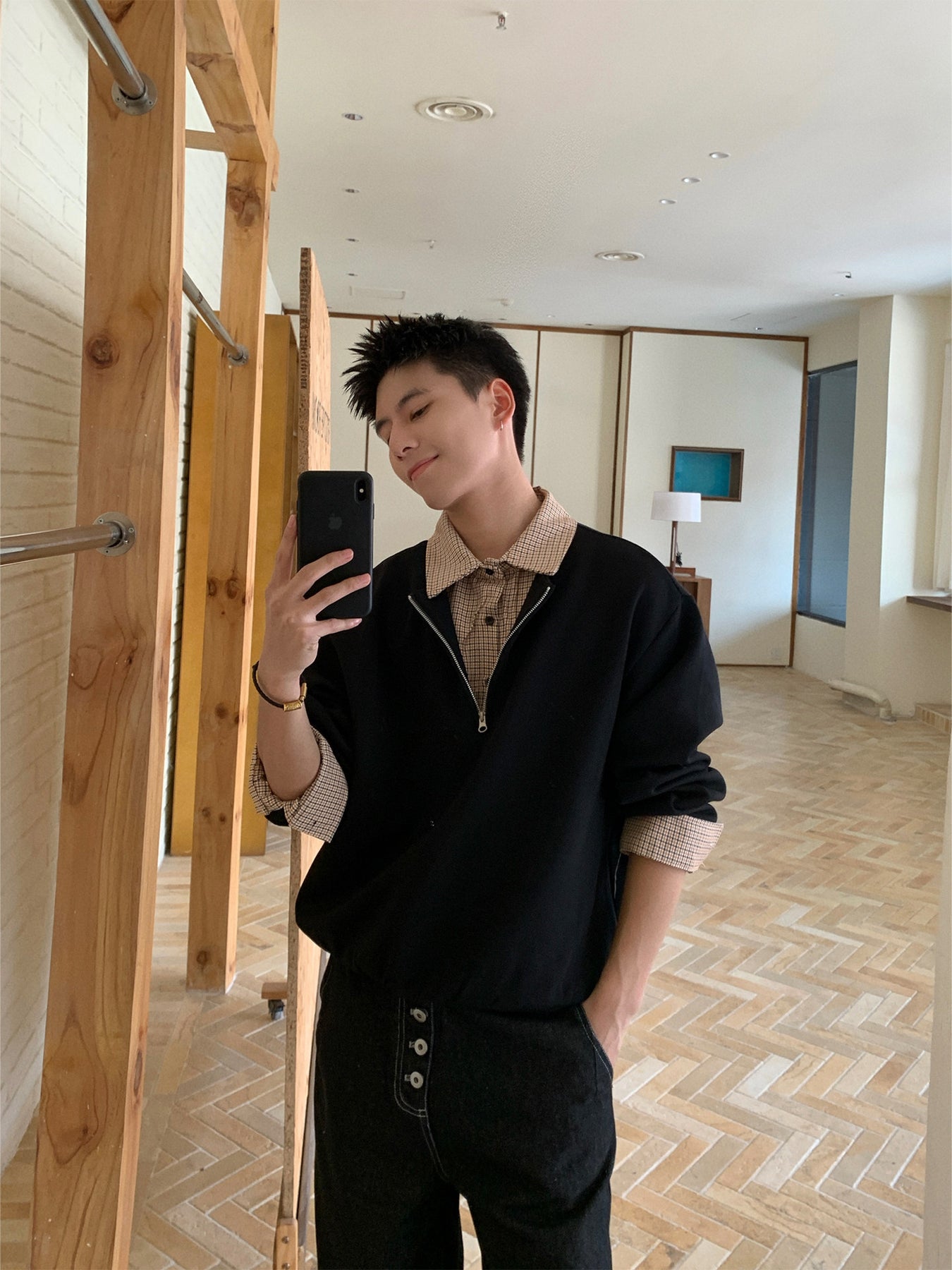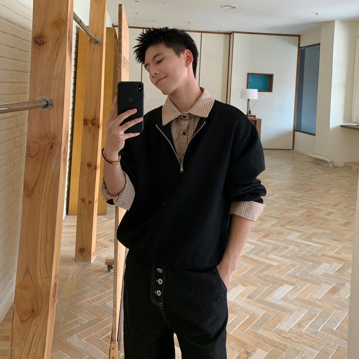 一枚で完成する“clean fit”スタイル。シャツを重ねたように見せるフェイクレイヤード仕様の、ハーフジップPOLOスウェットです。襟元から覗くチェック柄がさりげないアクセントとなり、カジュアルでありながらもどこか知的な印象を演出。アメリカンカジュアルの空気感を、今の都会的バランスで再構築しました。