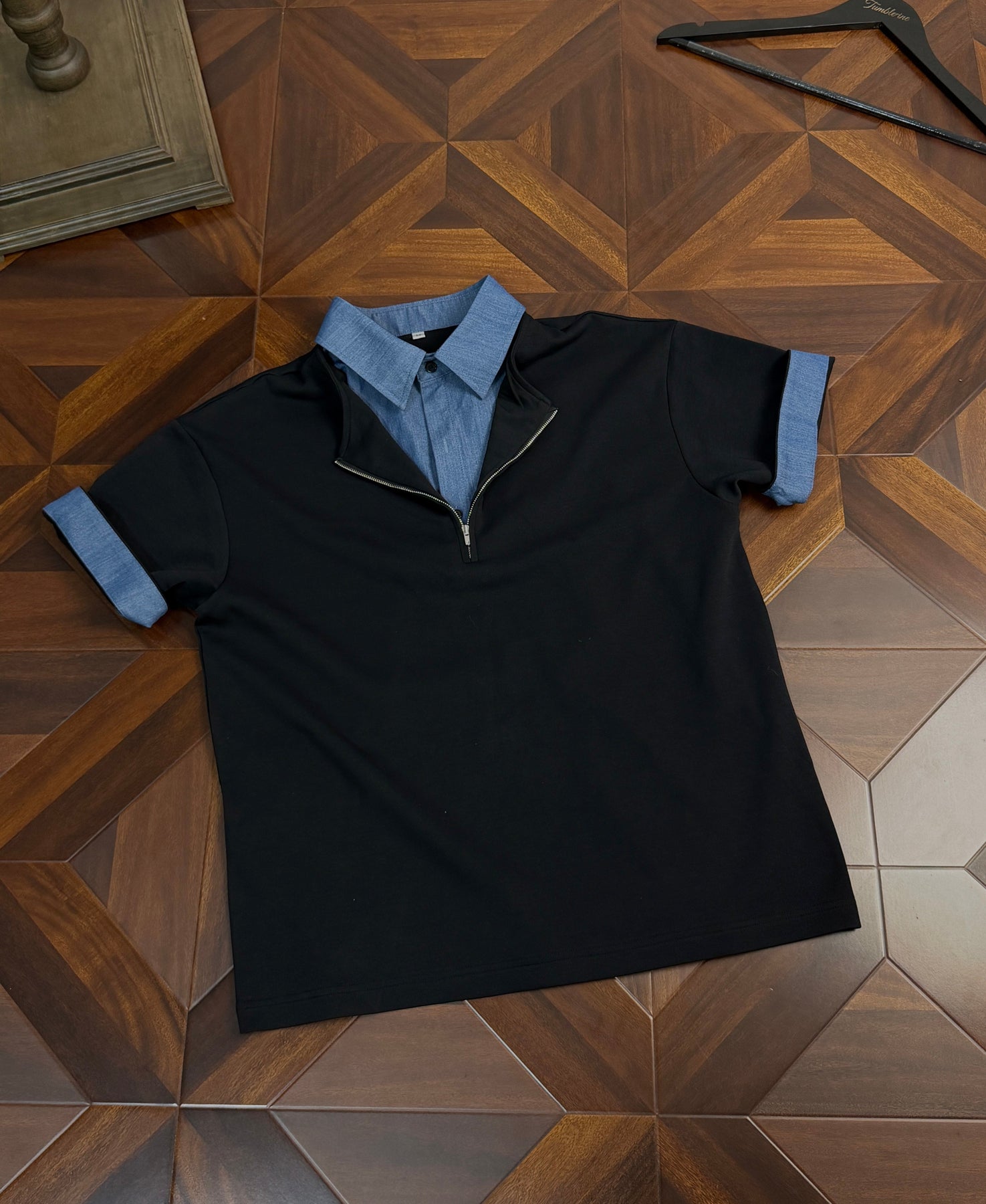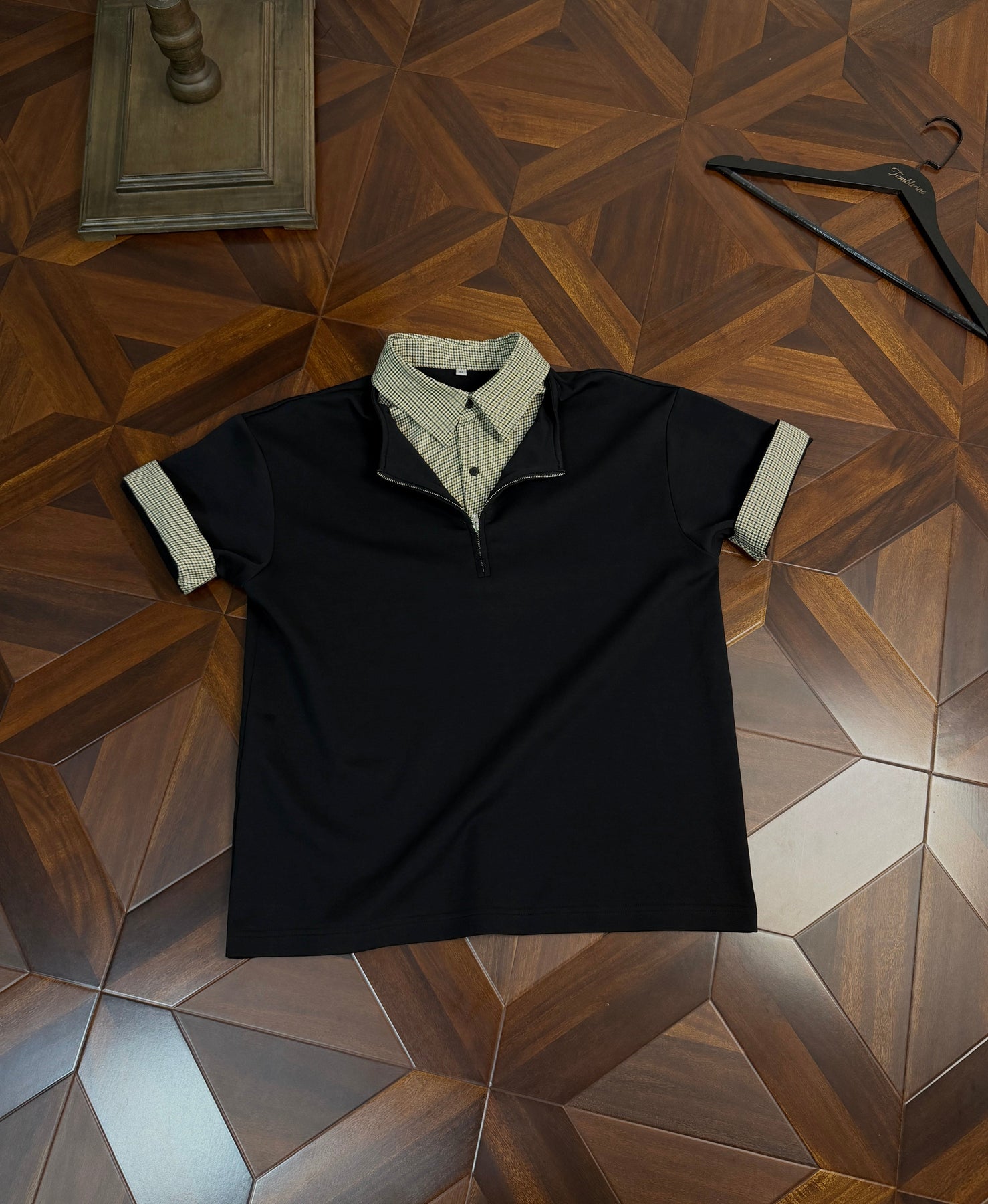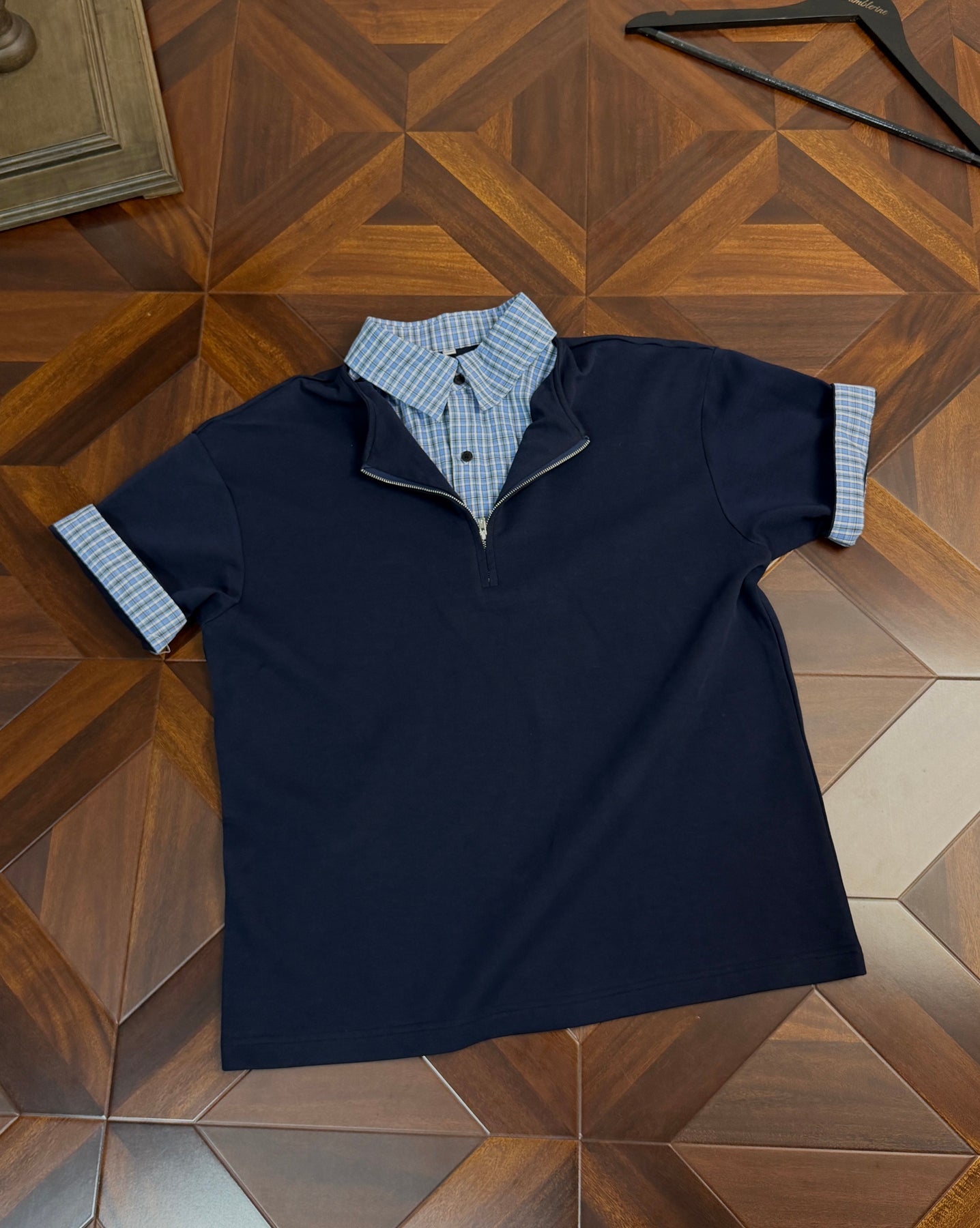 最大の特徴は、衿元に施された隠しジップデザイン。閉じた状態ではすっきりとしたポロシャツに見えながら、ジップを開くと千鳥格子またはチェック柄の内側が顔を出し、レイヤードしたような表情に変わります。袖口を折り返せばチェック柄が現れ、さらに異なるスタイリングを楽しめる遊び心も。