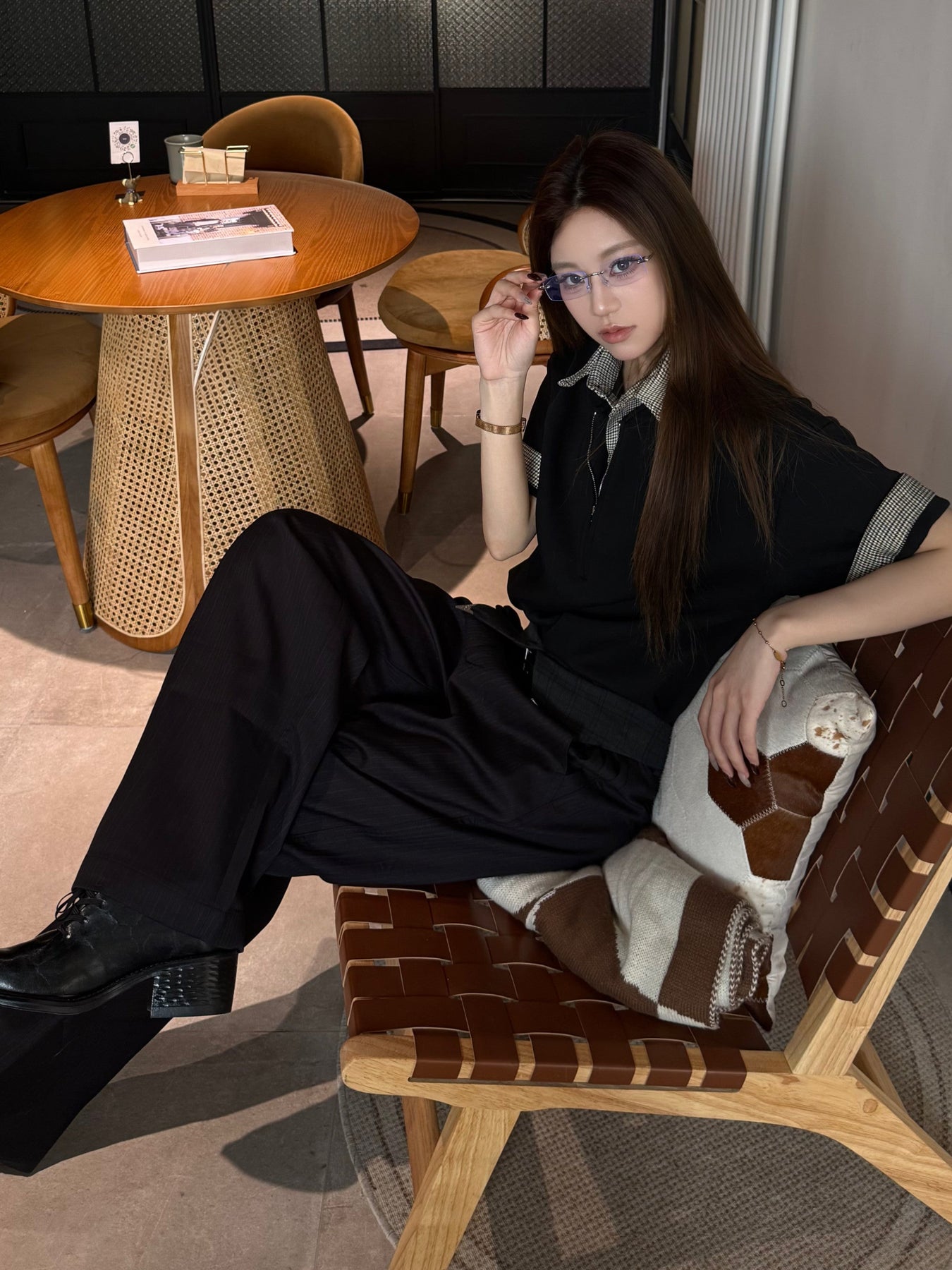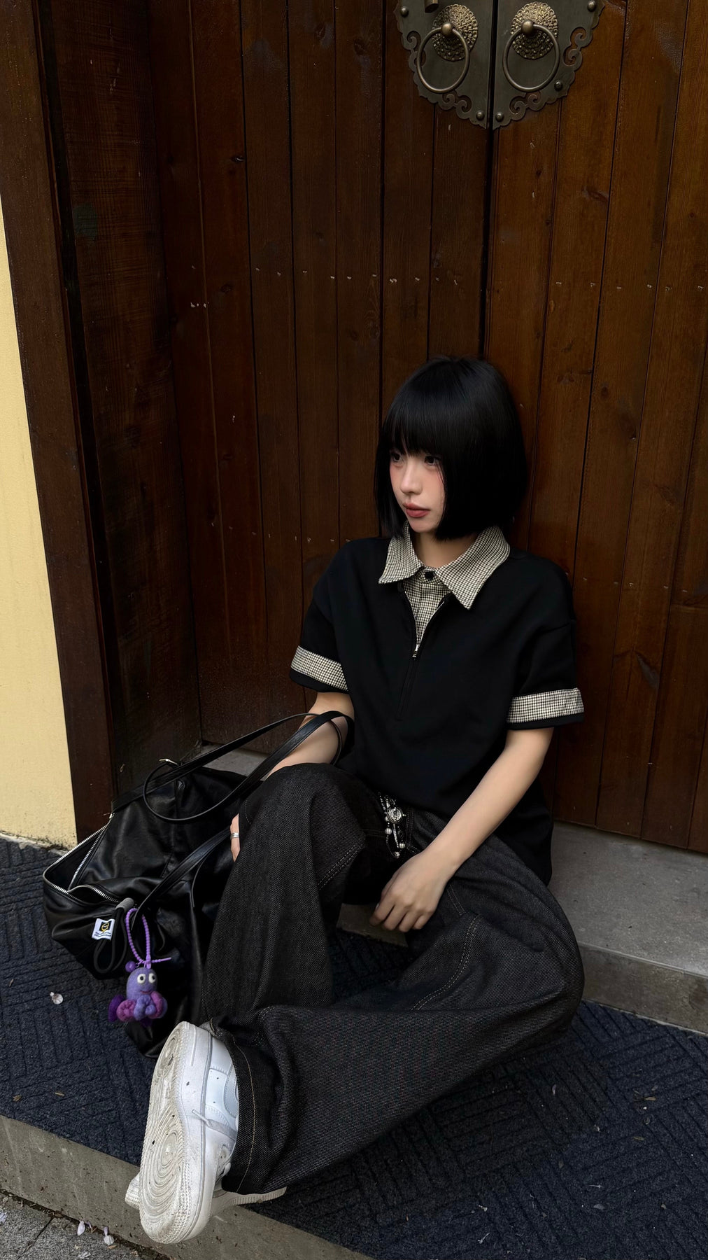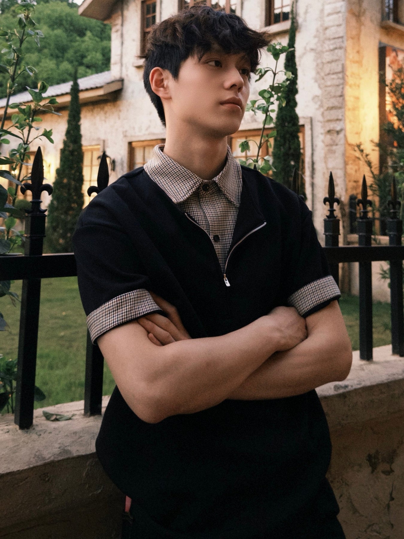 最大の特徴は、衿元に施された隠しジップデザイン。閉じた状態ではすっきりとしたポロシャツに見えながら、ジップを開くと千鳥格子またはチェック柄の内側が顔を出し、レイヤードしたような表情に変わります。袖口を折り返せばチェック柄が現れ、さらに異なるスタイリングを楽しめる遊び心も。
