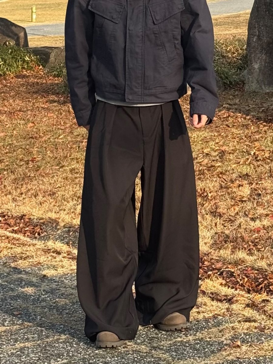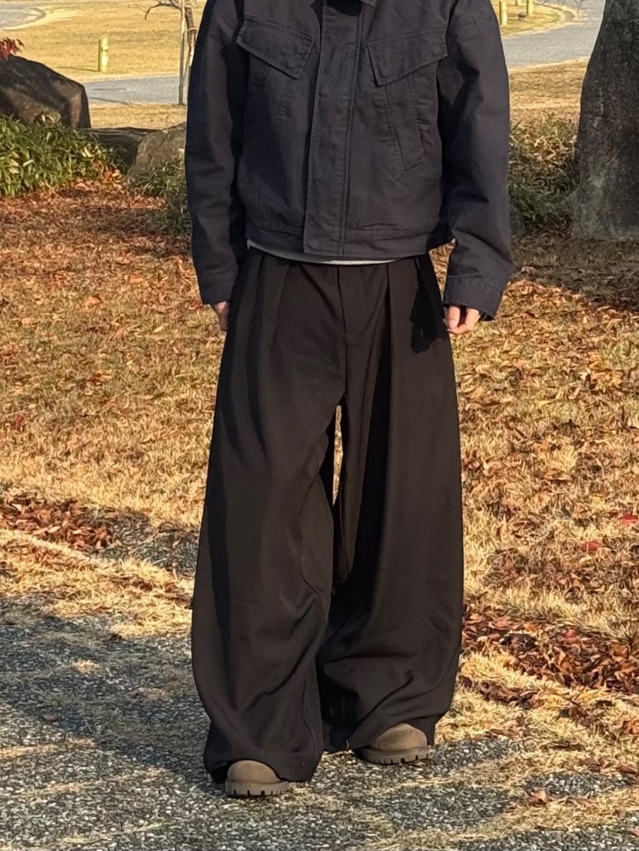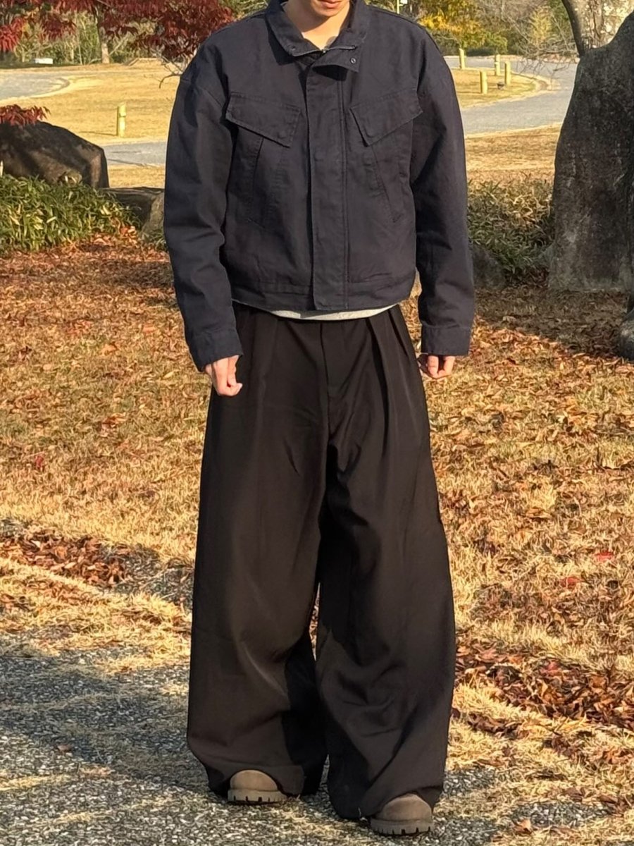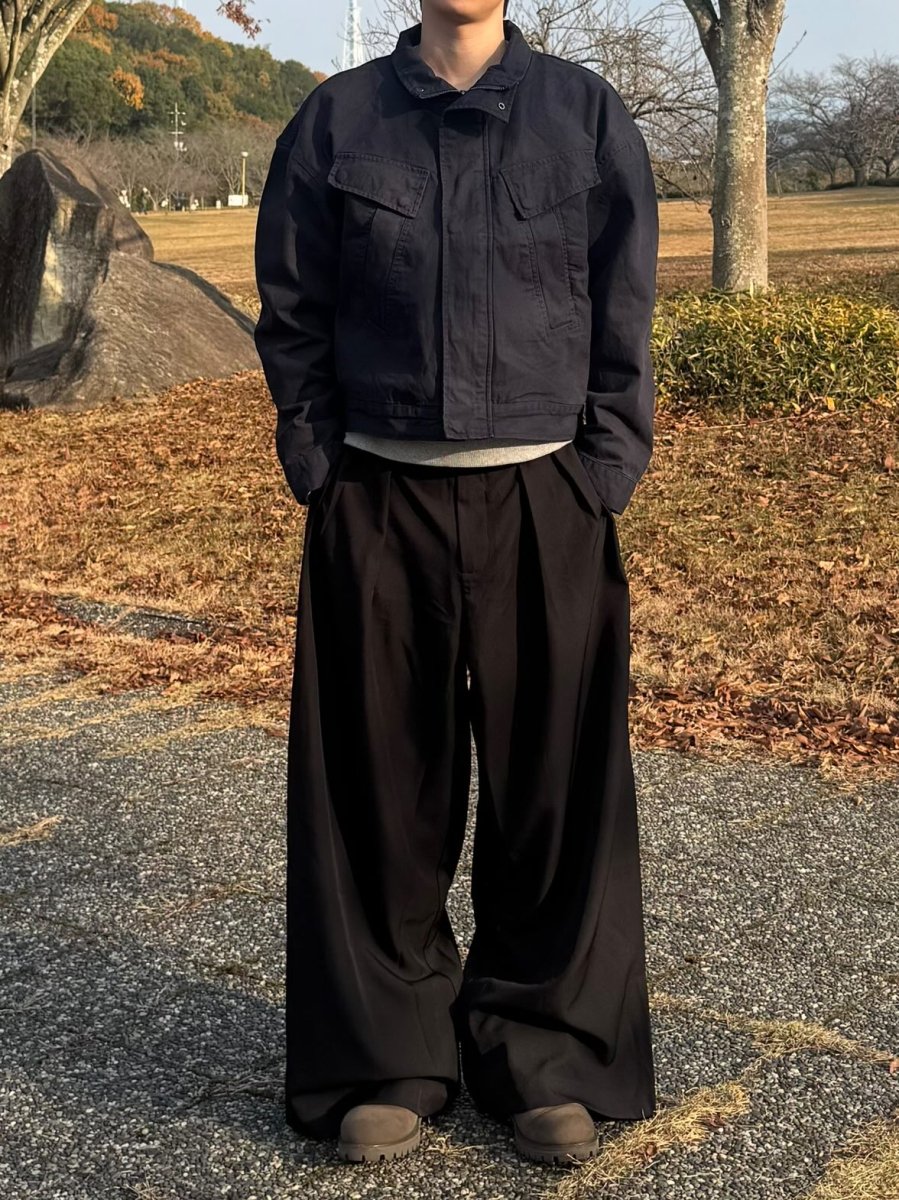 落ち感のある生地がつくるドレープが美しくて、歩くたびに揺れるシルエットが主役になるワイドトラウザー。無骨なショートジャケットを合わせても上品さが残るのが、このパンツの強み。オールブラックでまとめると潔くキマって、“ゆるいのに清潔感がある”大人のモードストリートに仕上がります。