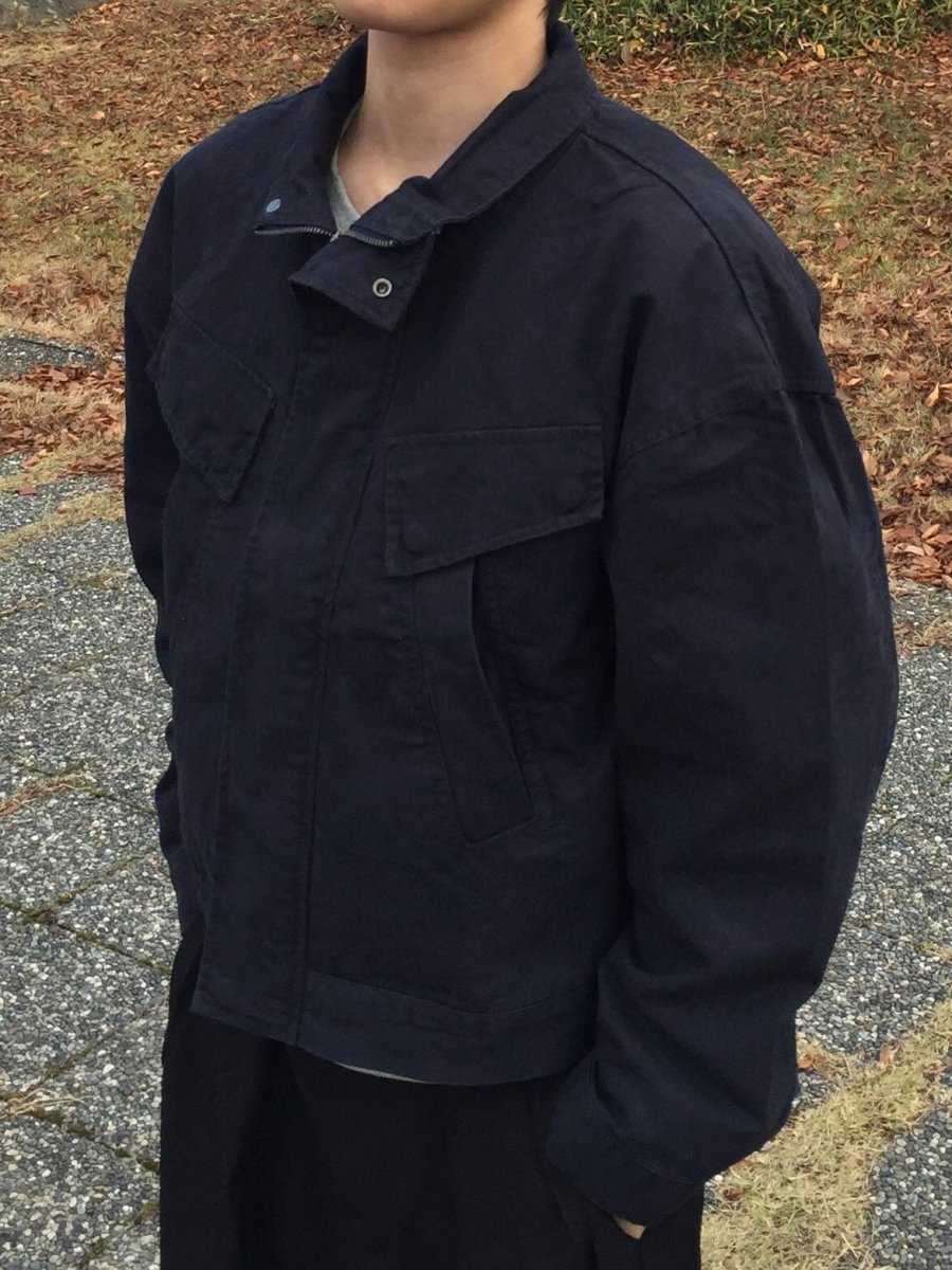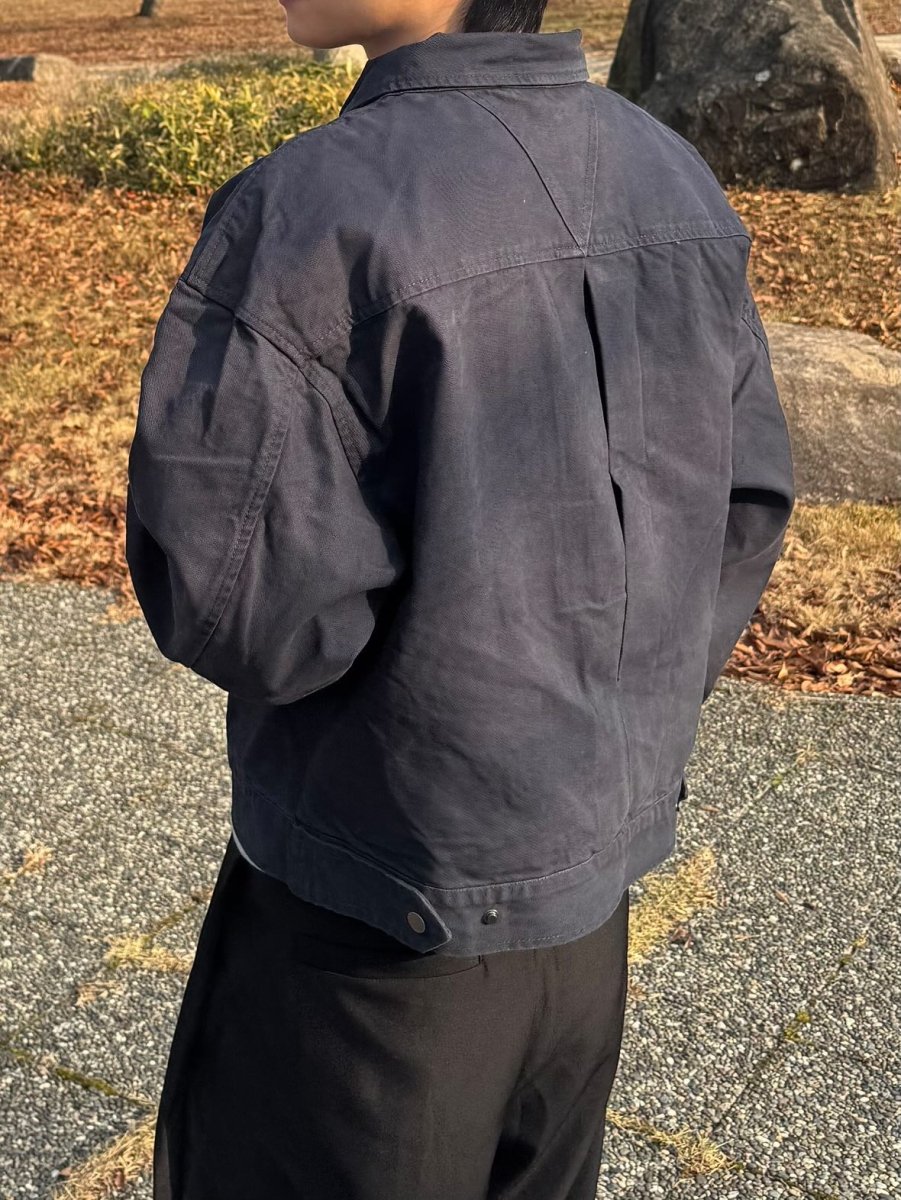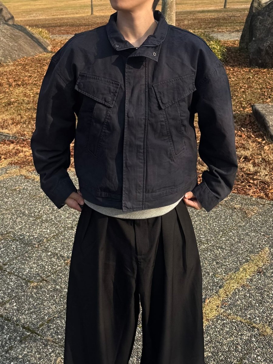 程よい退色感が魅力のウォッシュドショートブルゾンは、着るだけで深みのあるワーク感が出る一枚。ドレープの効いたワイドトラウザーを合わせて、無骨さと上品さをミックスしたバランスにしました。全体をダークトーンでまとめることでシルエットの良さがより引き立ち、“ラフなのに雰囲気のある”大人のワークスタイルに仕上がっています。