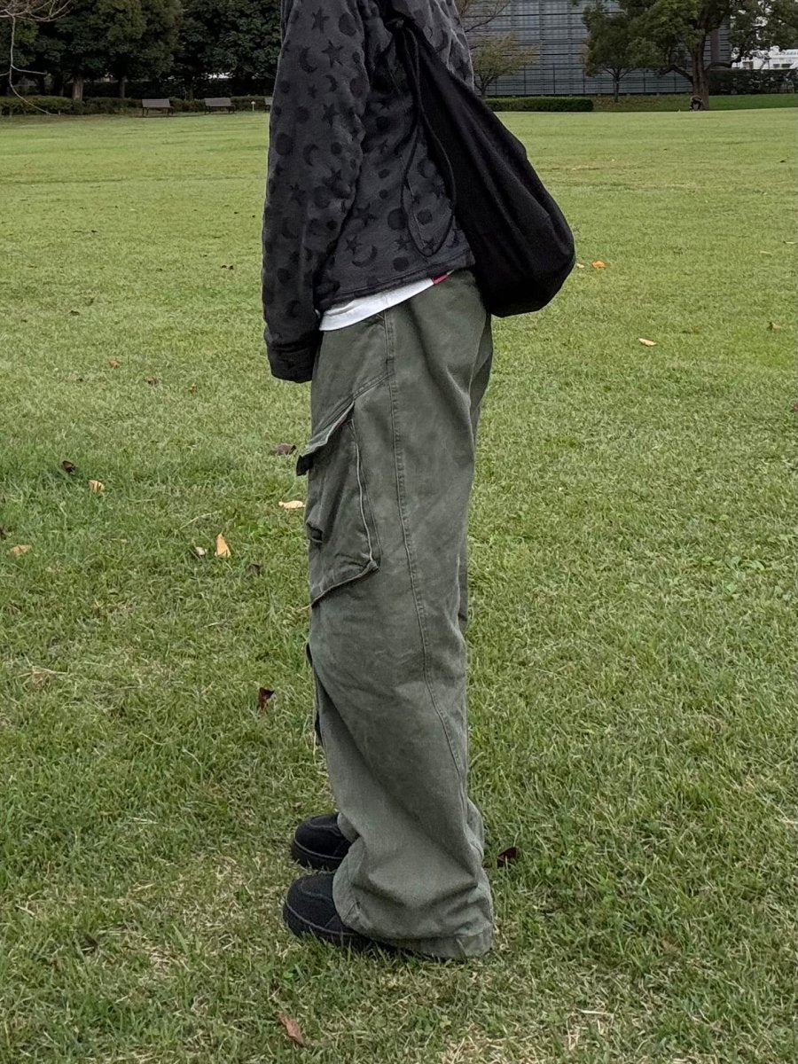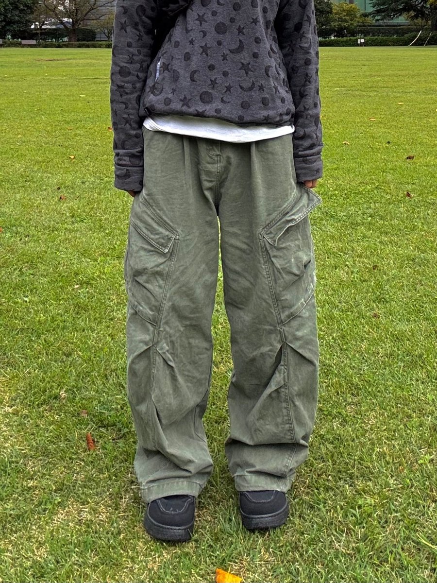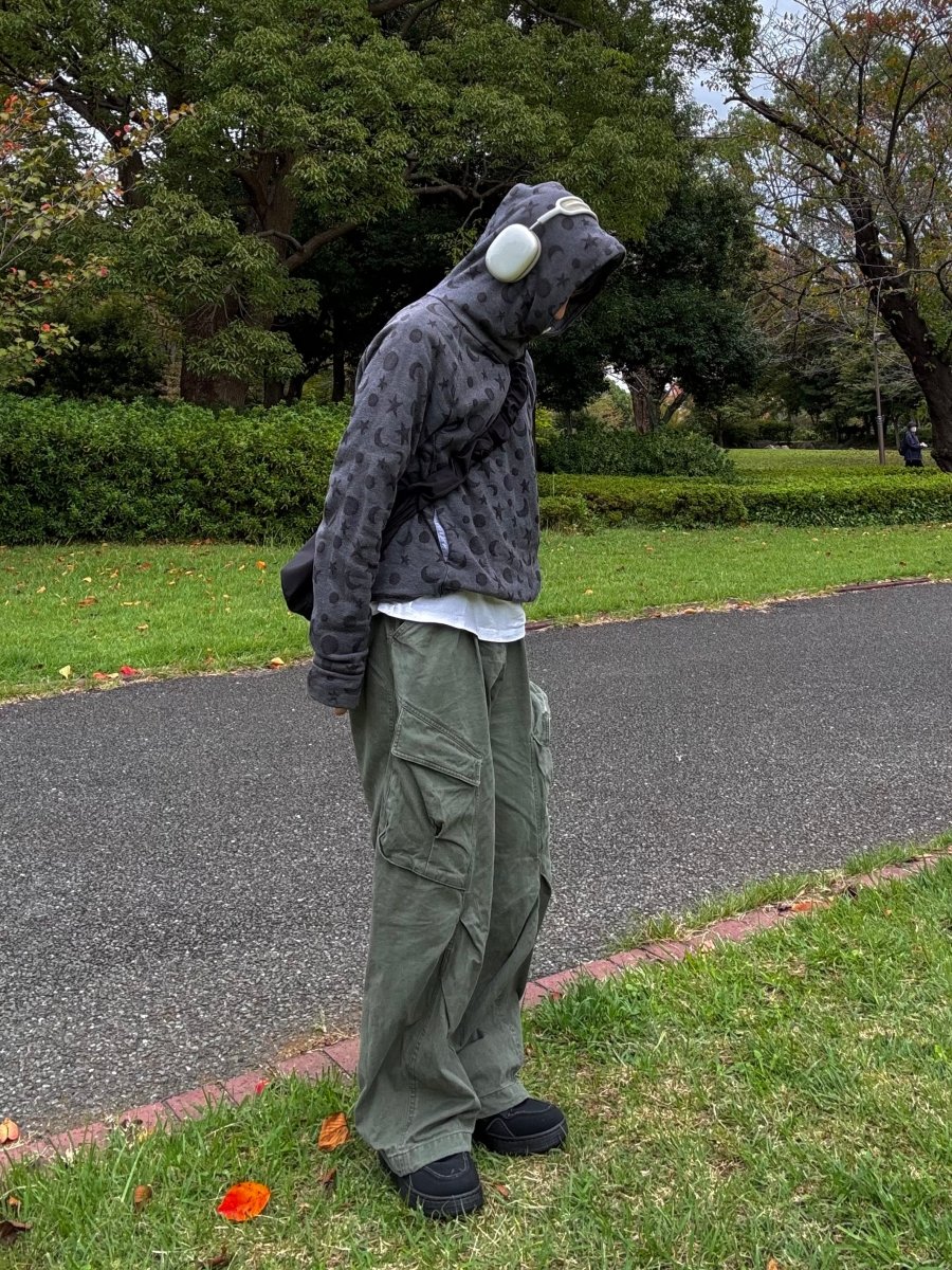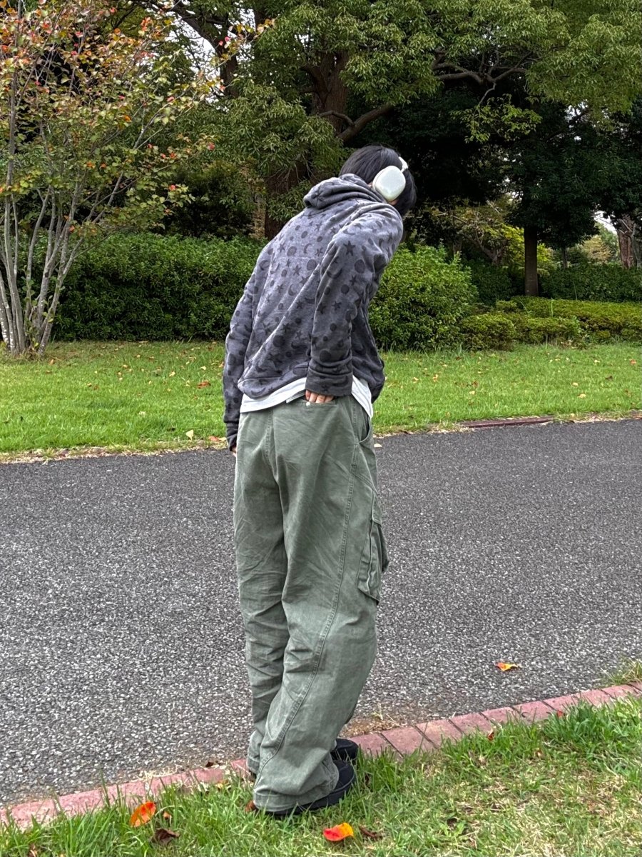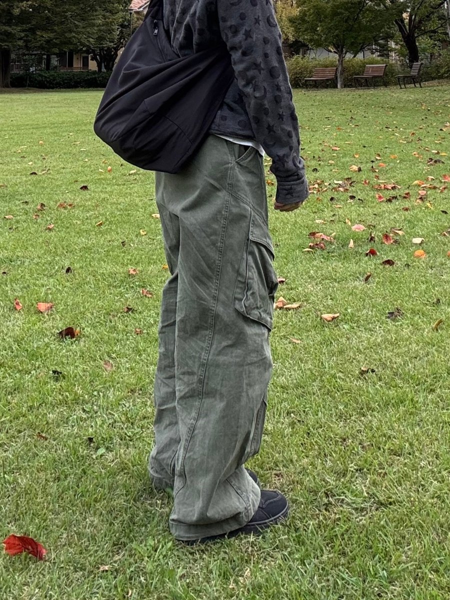 カーキ×チャコールグレーのトーンで統一し、抜け感のあるバランスに仕上げた。ワイドなパンツが生み出すリラックス感と、立体的なポケットディテールが存在感を演出。ラフだけど計算されたシルエットで、都会のムードにも馴染む大人のオフスタイル。