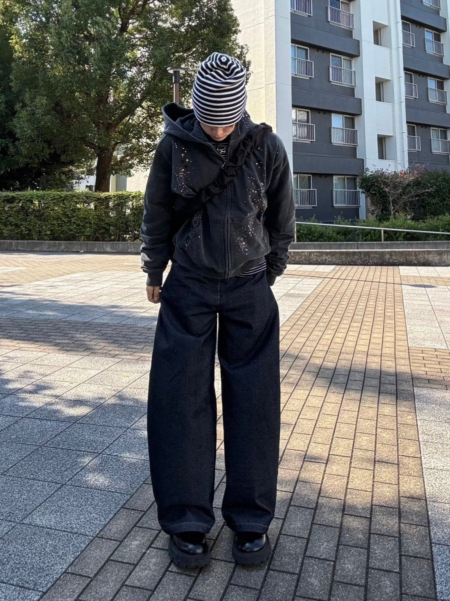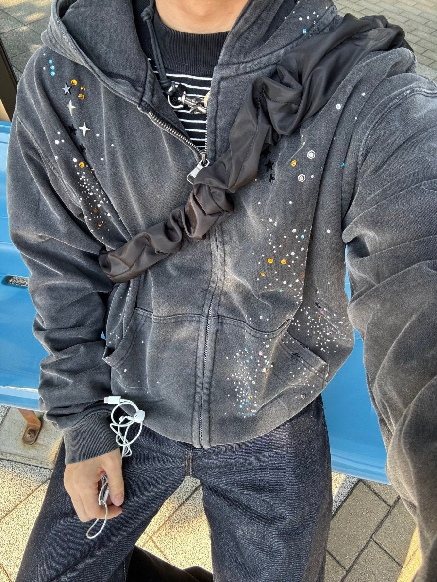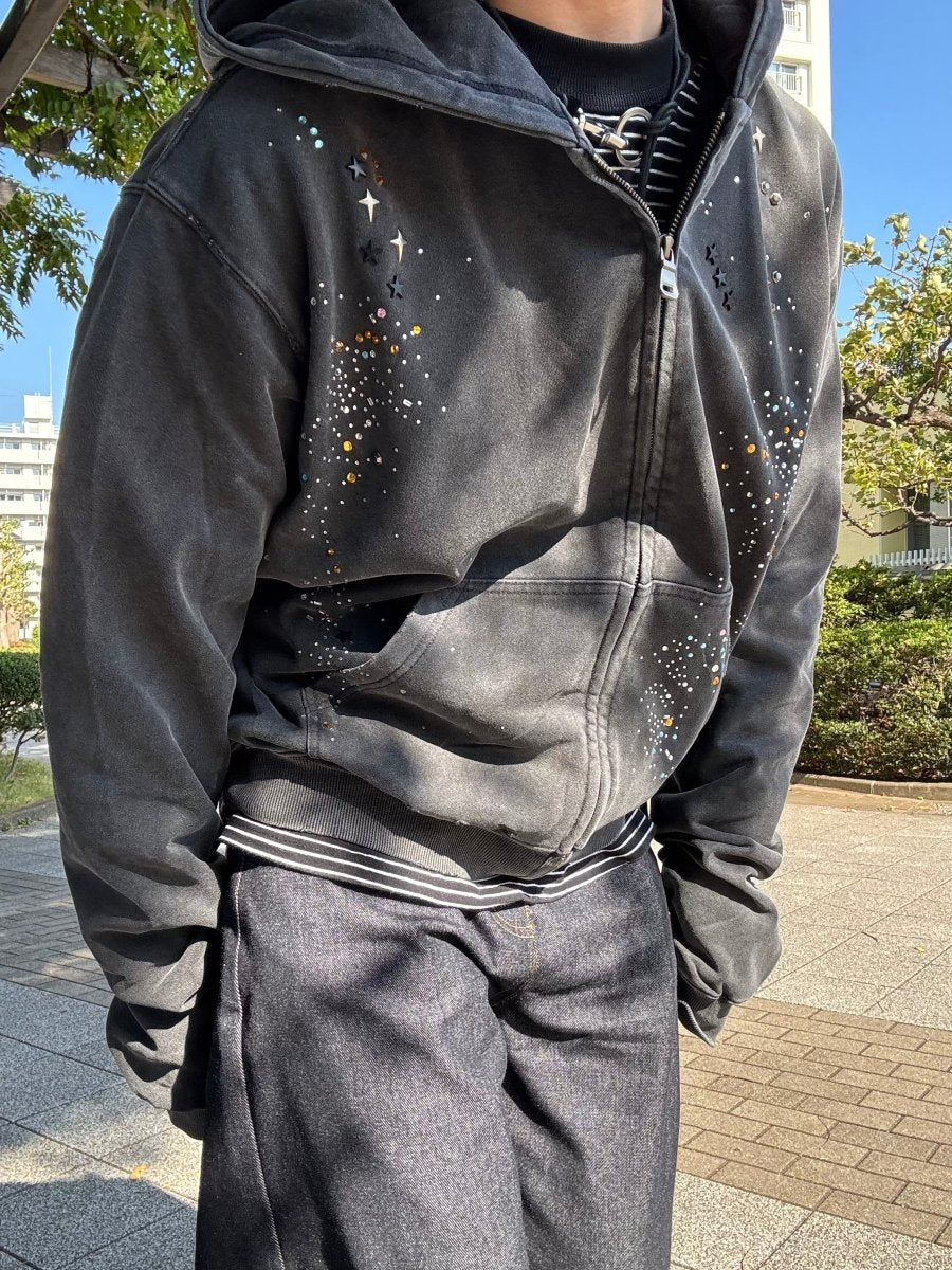 このフーディーは、ウォッシュ加工のヴィンテージ感と、散りばめられたストーンデザインが主役。星形のスタッズも混じってて、マジで他にない。今日はボーダーをインナーに差して、レイヤード感をプラス。濃いめデニムと合わせるだけで、グランジでY2Kなストリートスタイルの完成。