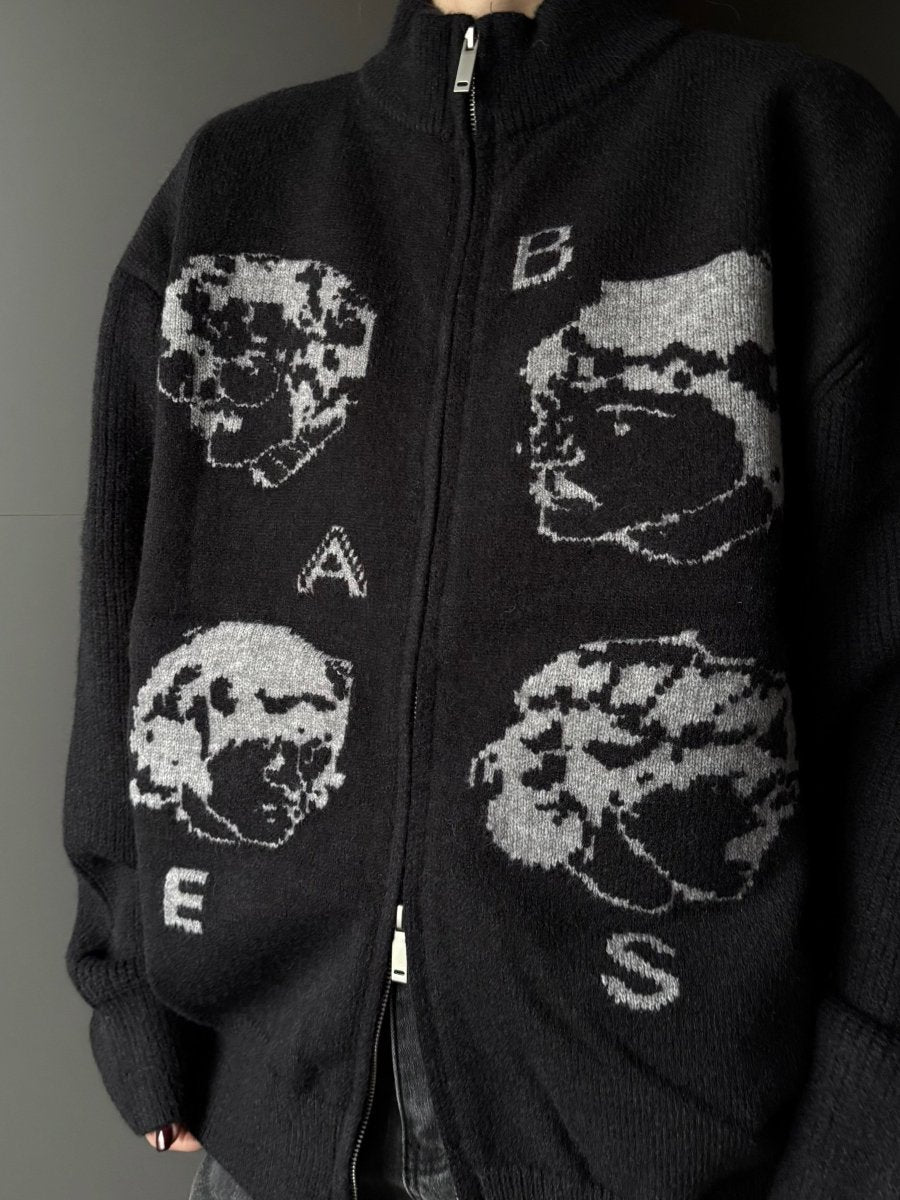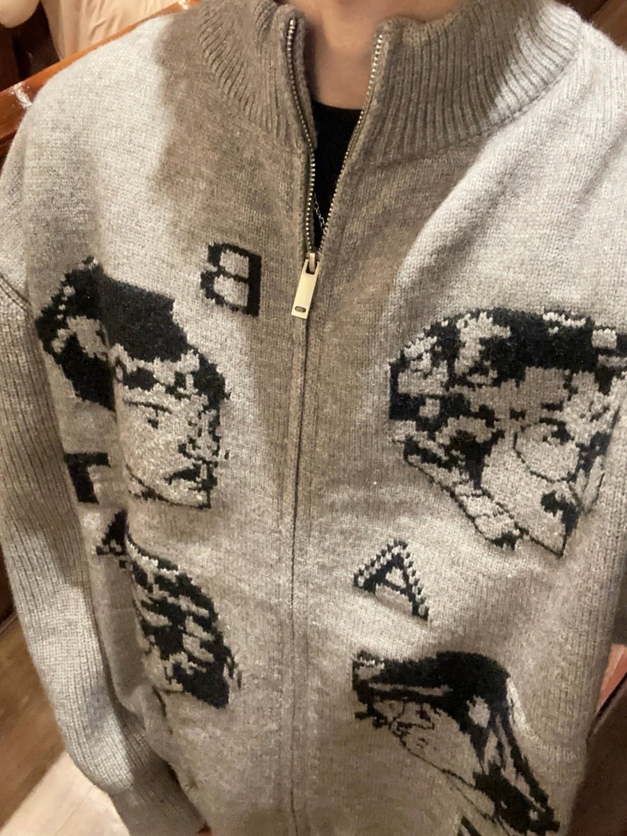 視線を惹きつけるアート性と、着るほどに実感する上質感。その両方を兼ね備えた、ヴィンテージムード漂う立衿ジップニットアウターです。フロント全面に施された人像モチーフは、プリントではなくジャカード編みで表現。編み地そのものに柄を落とし込むことで、奥行きのある陰影と、時間を重ねても色褪せない存在感を生み出しています。