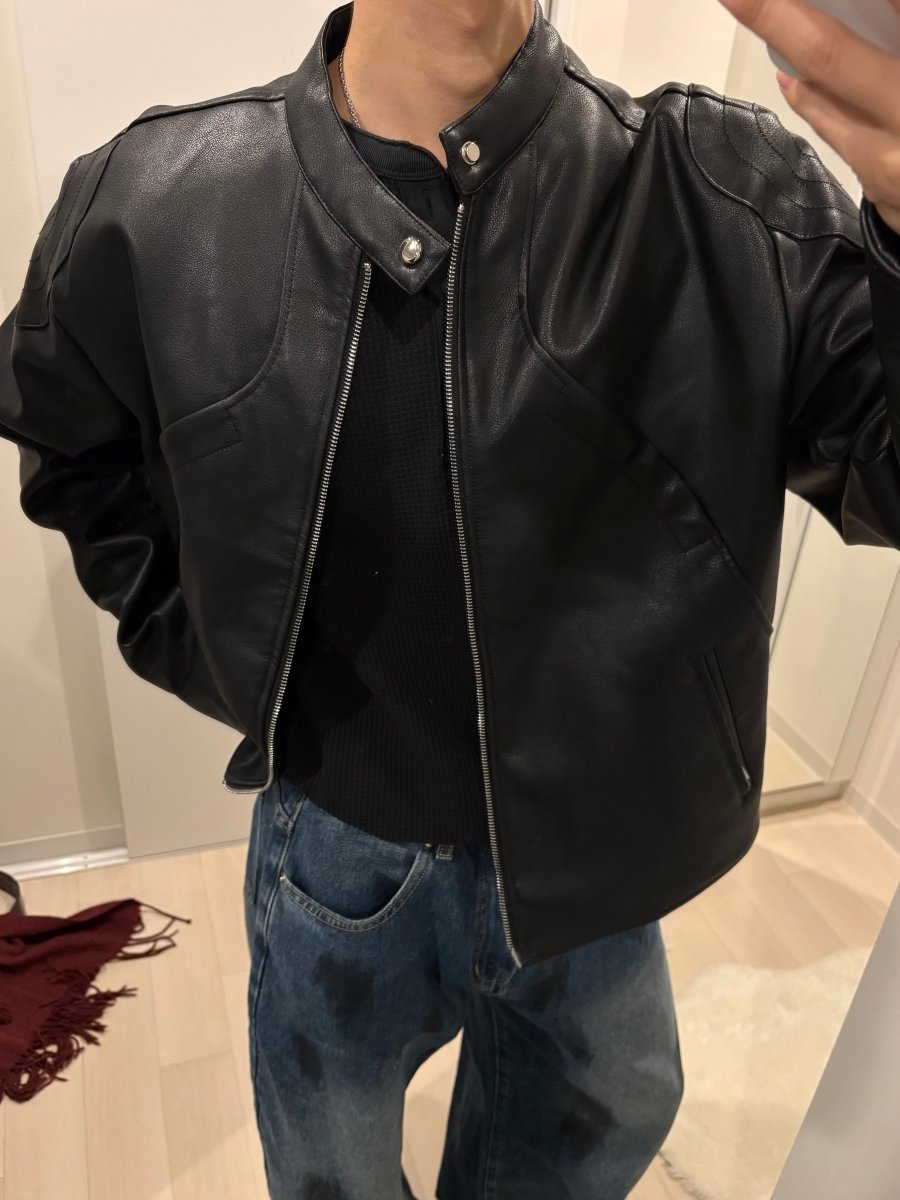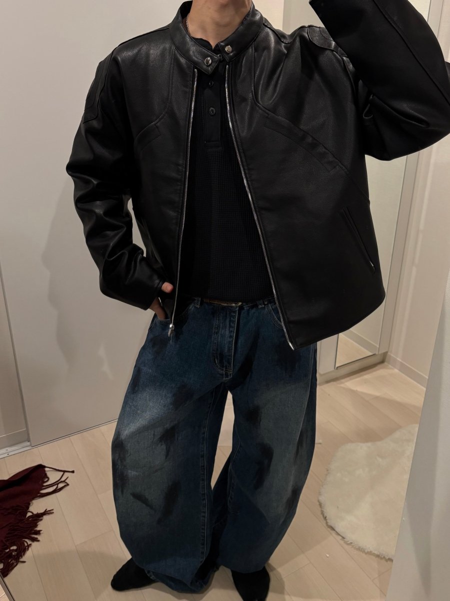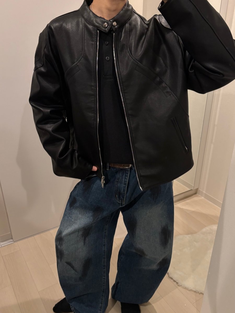 シルエットは今っぽいルーズフィット。インナーにニットやスウェットを合わせても余裕があり、長いシーズン活躍します。僕はワイドデニムと合わせて、少し力の抜けた“かっこいい”なスタイルで着るのがおすすめ。正直、クローゼットにあると頼りになる、大人のためのレザージャケットです。