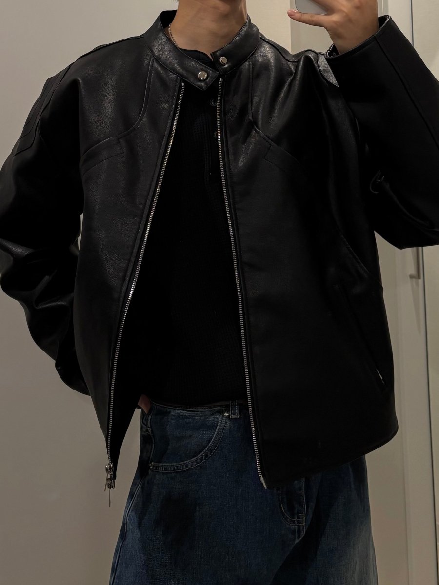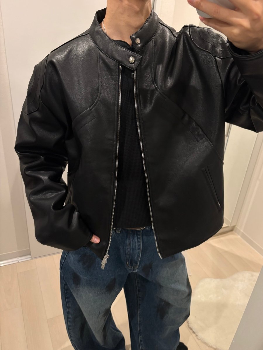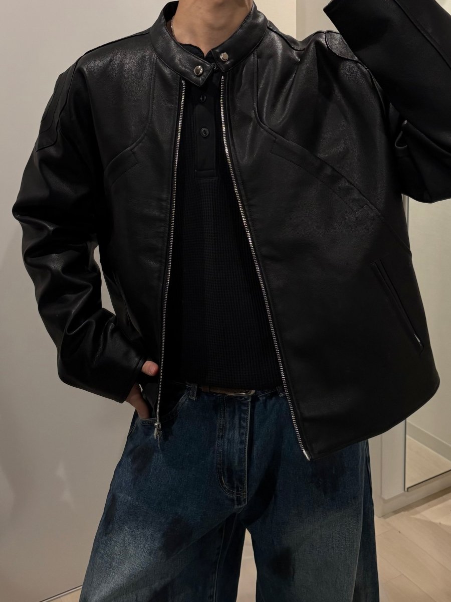 素材には上質感のあるPUレザーを使用。マットすぎず、テカりすぎない絶妙な質感で、リアルレザーに近い表情を楽しめます。程よくハリがあり、着ると自然に立体感が出るので、ラフに着てもだらしなく見えません。