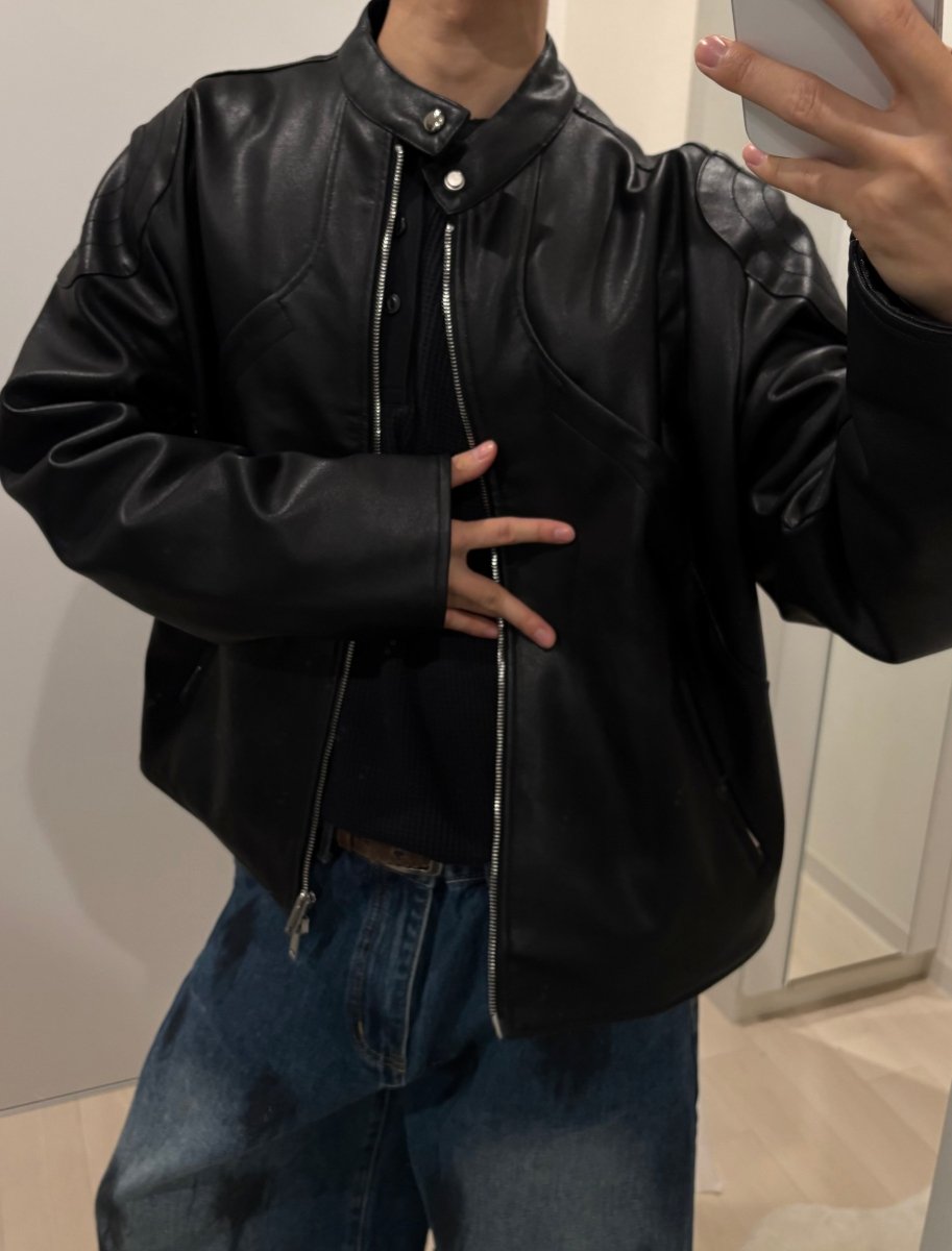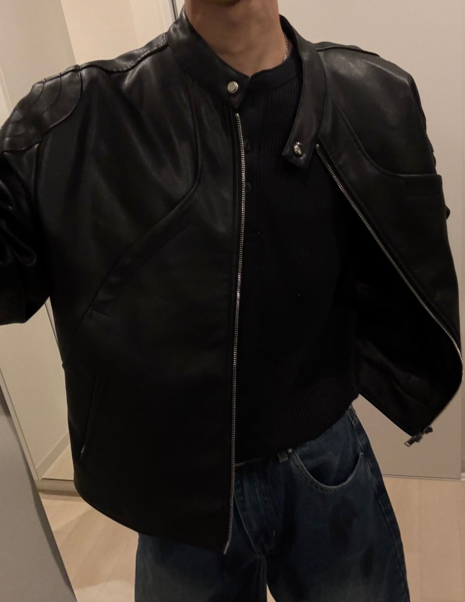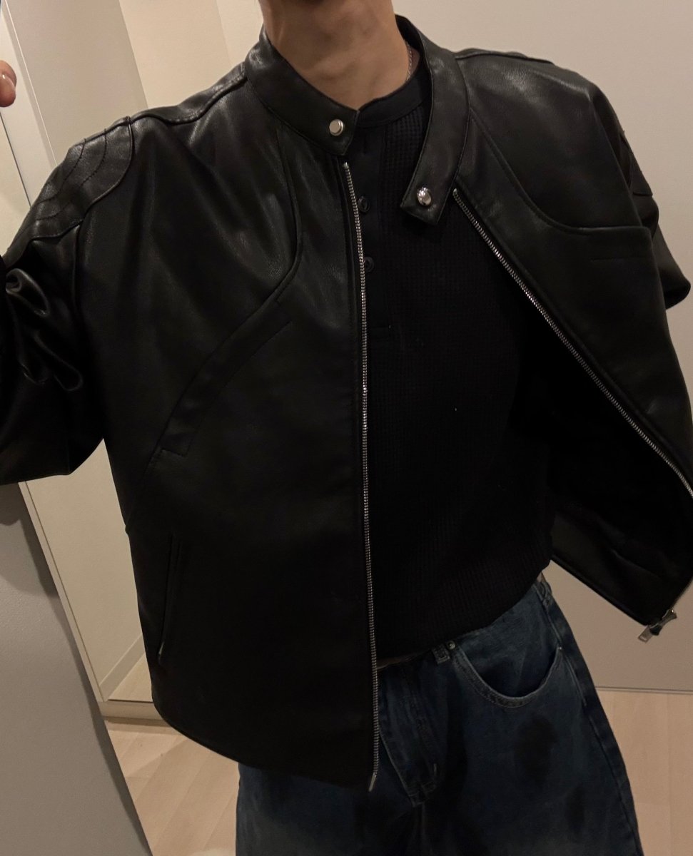 素材には上質感のあるPUレザーを使用。マットすぎず、テカりすぎない絶妙な質感で、リアルレザーに近い表情を楽しめます。程よくハリがあり、着ると自然に立体感が出るので、ラフに着てもだらしなく見えません。