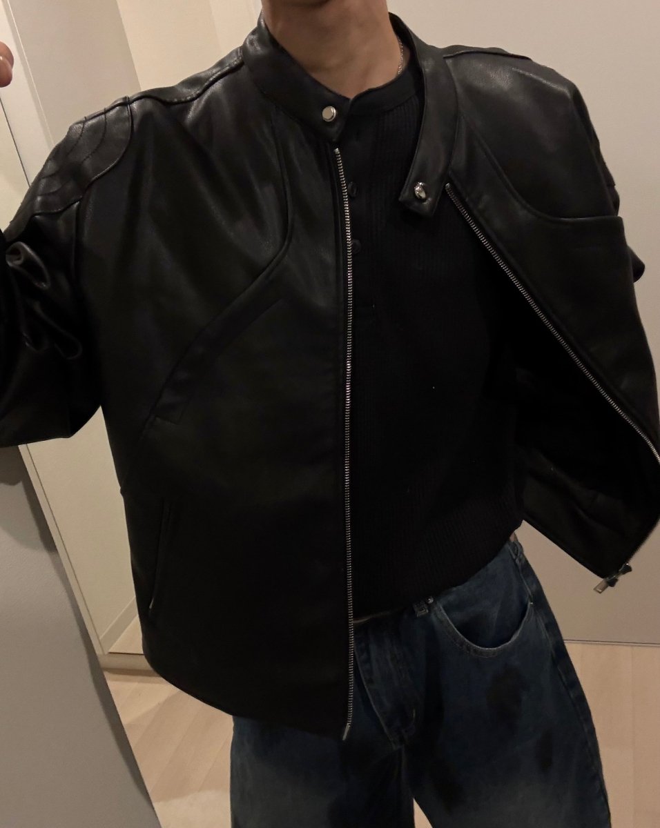 アメリカンヴィンテージのバイカージャケットをベースに、ミニマルな小ぶりスタンドカラーで今の気分に仕上げた一着。無骨さがありながらも、構築的な切り替えと計算されたシルエットで、どこか都会的に見えるのがポイントです。