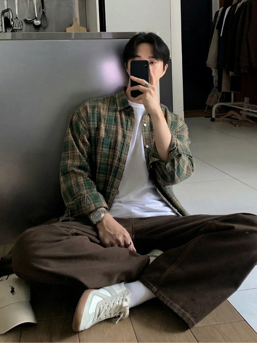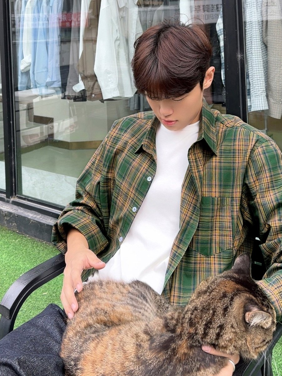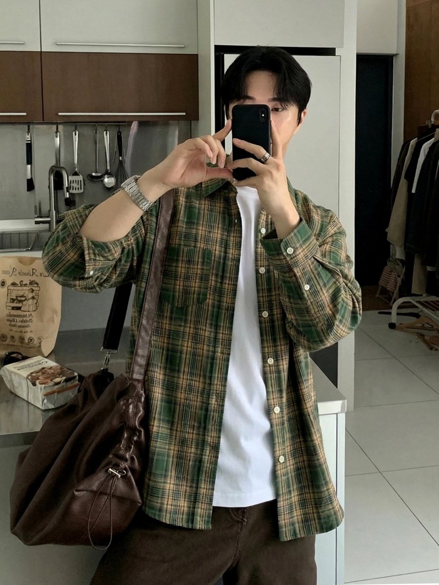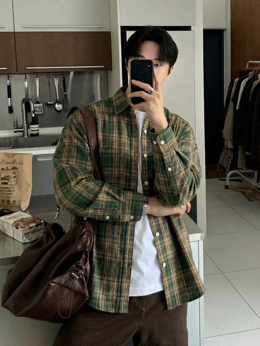 どこか懐かしさを感じさせるグリーンチェックが印象的な、レトロムード漂うルーズシャツ。肩の力を抜いたワイドシルエットと、軽やかな配色バランスが、今の韓国メンズらしい“少年感”をさりげなく表現します。
