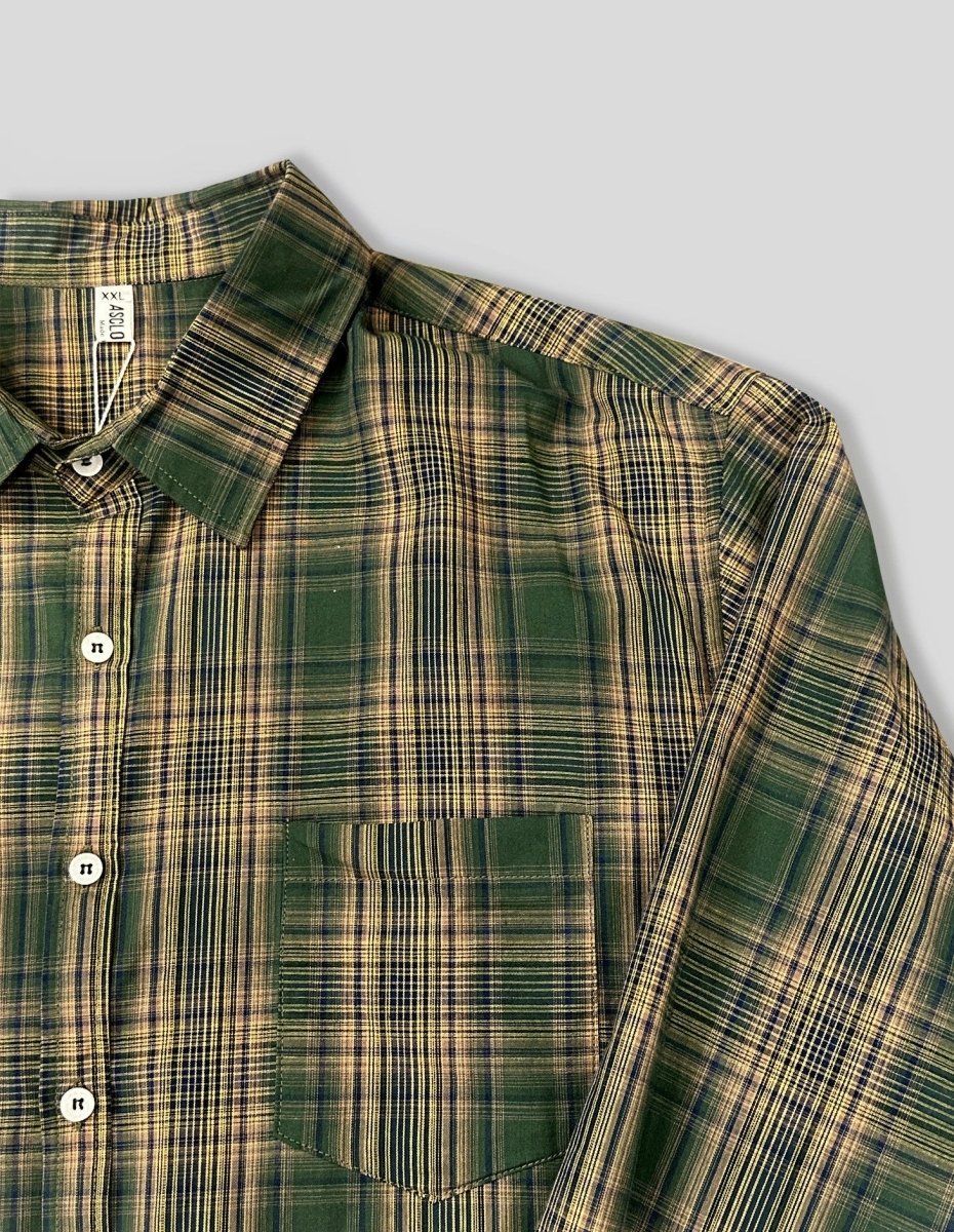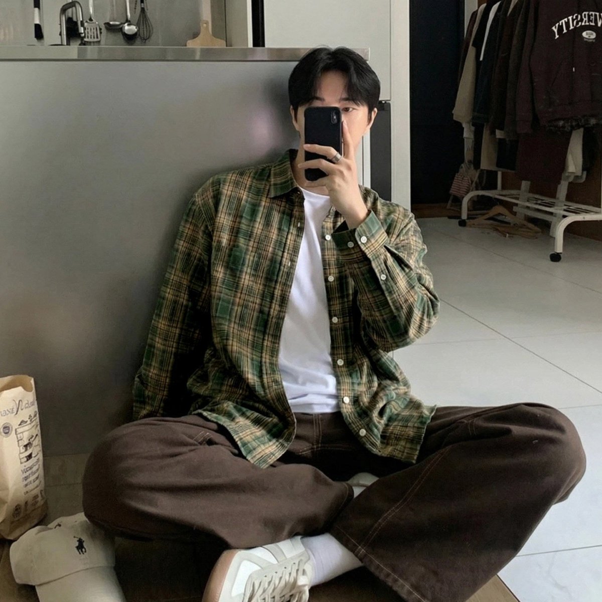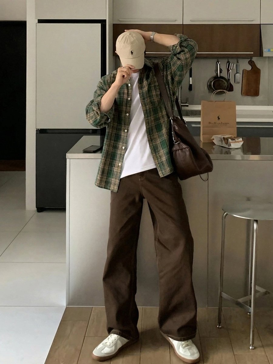 どこか懐かしさを感じさせるグリーンチェックが印象的な、レトロムード漂うルーズシャツ。肩の力を抜いたワイドシルエットと、軽やかな配色バランスが、今の韓国メンズらしい“少年感”をさりげなく表現します。