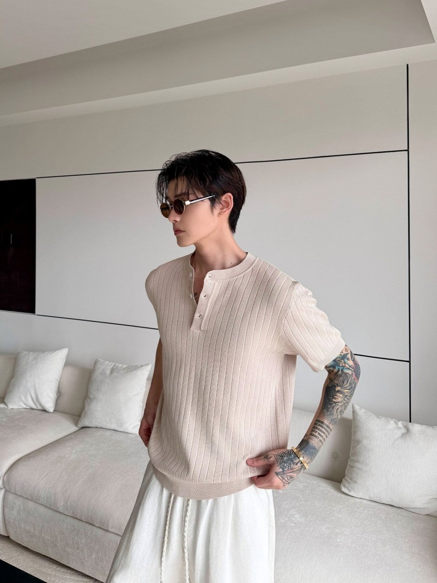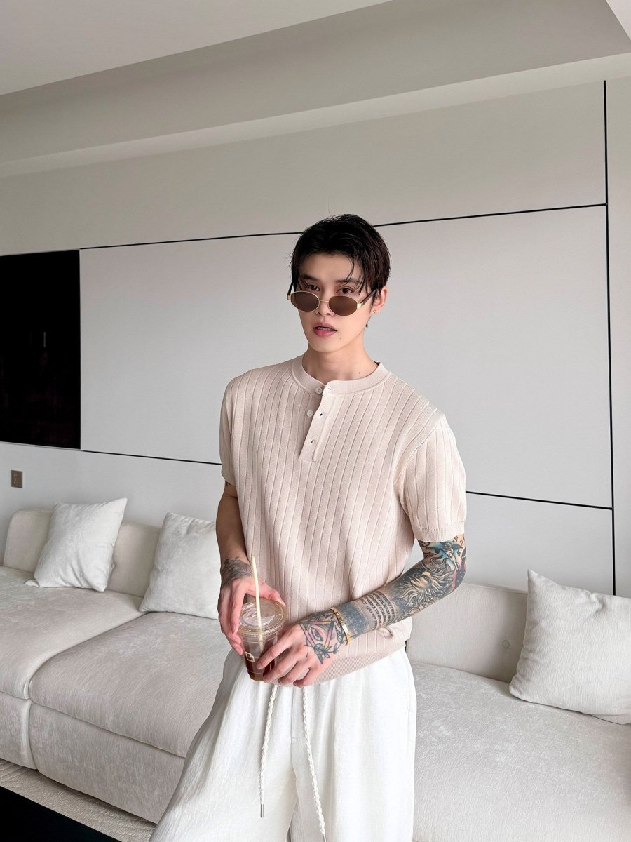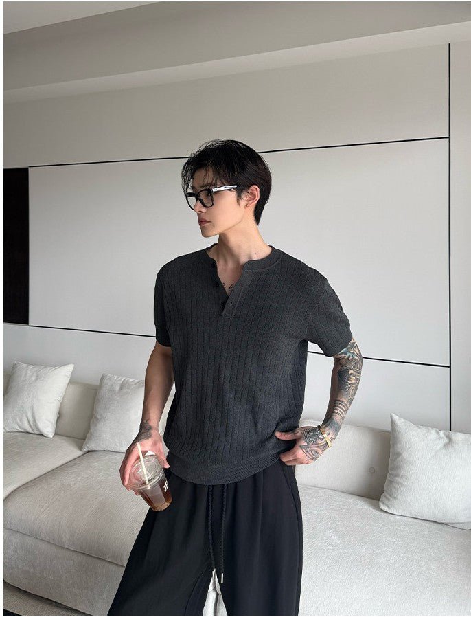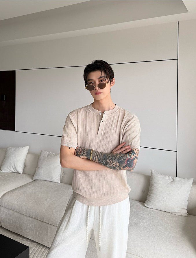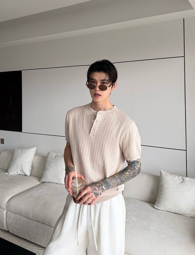 縦リブ編みの整然とした表面感と、ヘンリーネックのさりげないボタンデザインが、シンプルなニットTシャツに静かな品格を与えます。装飾を極限まで削ぎ落としたミニマルなデザインだからこそ、素材の質感と編み目の美しさがそのまま個性になる一枚です。