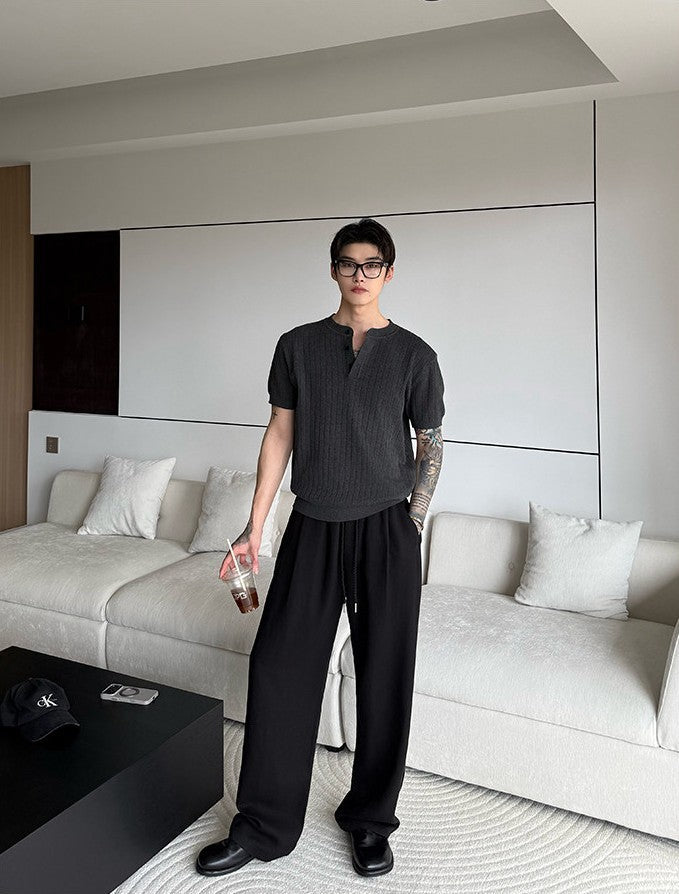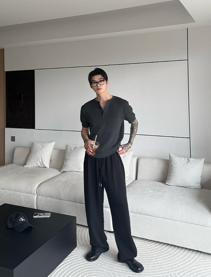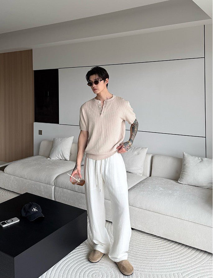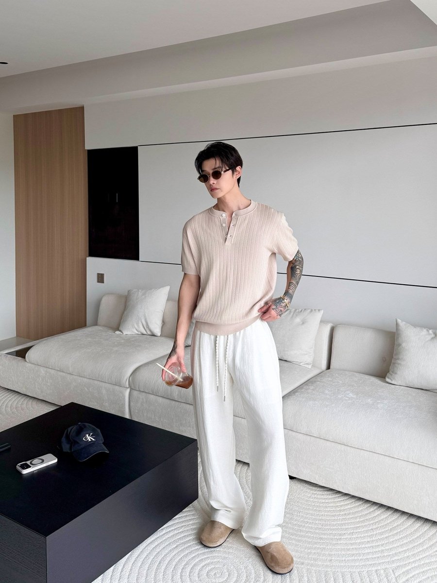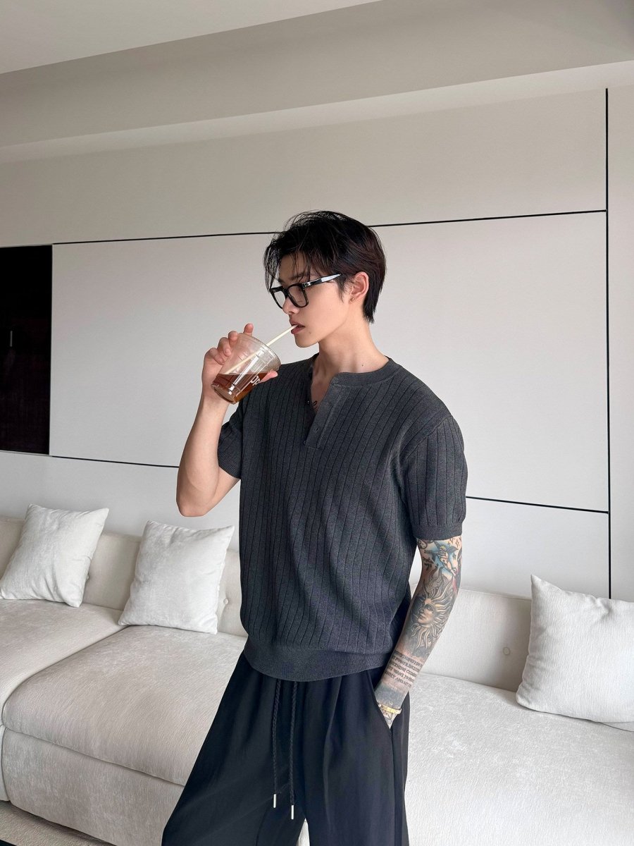 縦リブ編みの整然とした表面感と、ヘンリーネックのさりげないボタンデザインが、シンプルなニットTシャツに静かな品格を与えます。装飾を極限まで削ぎ落としたミニマルなデザインだからこそ、素材の質感と編み目の美しさがそのまま個性になる一枚です。