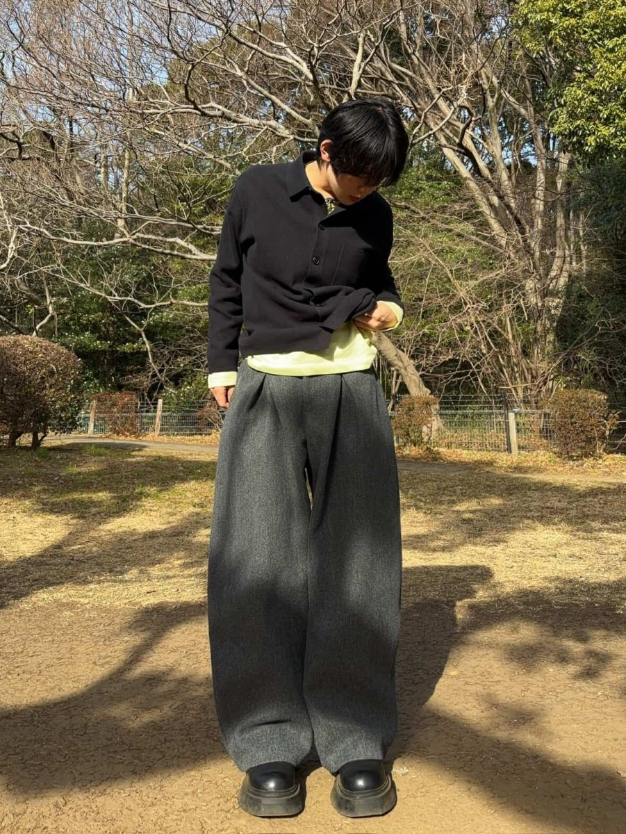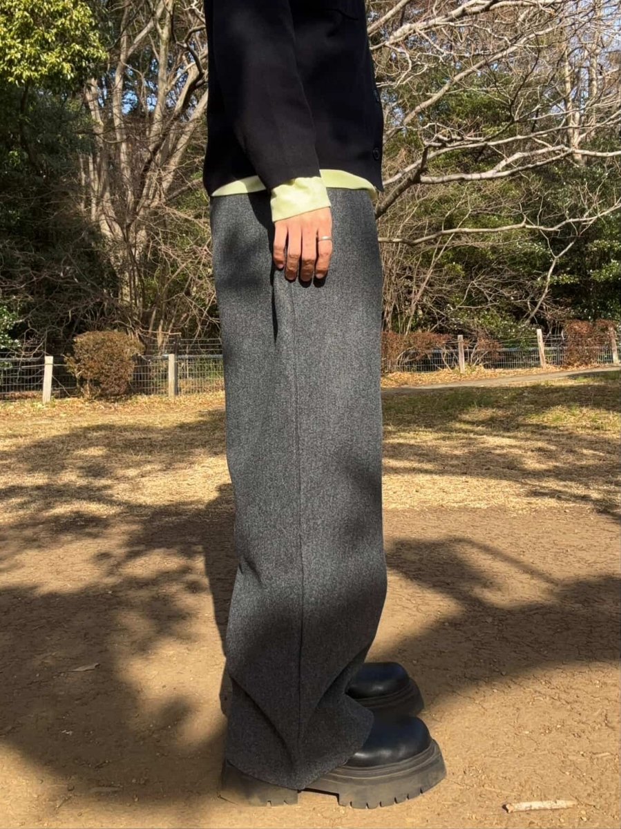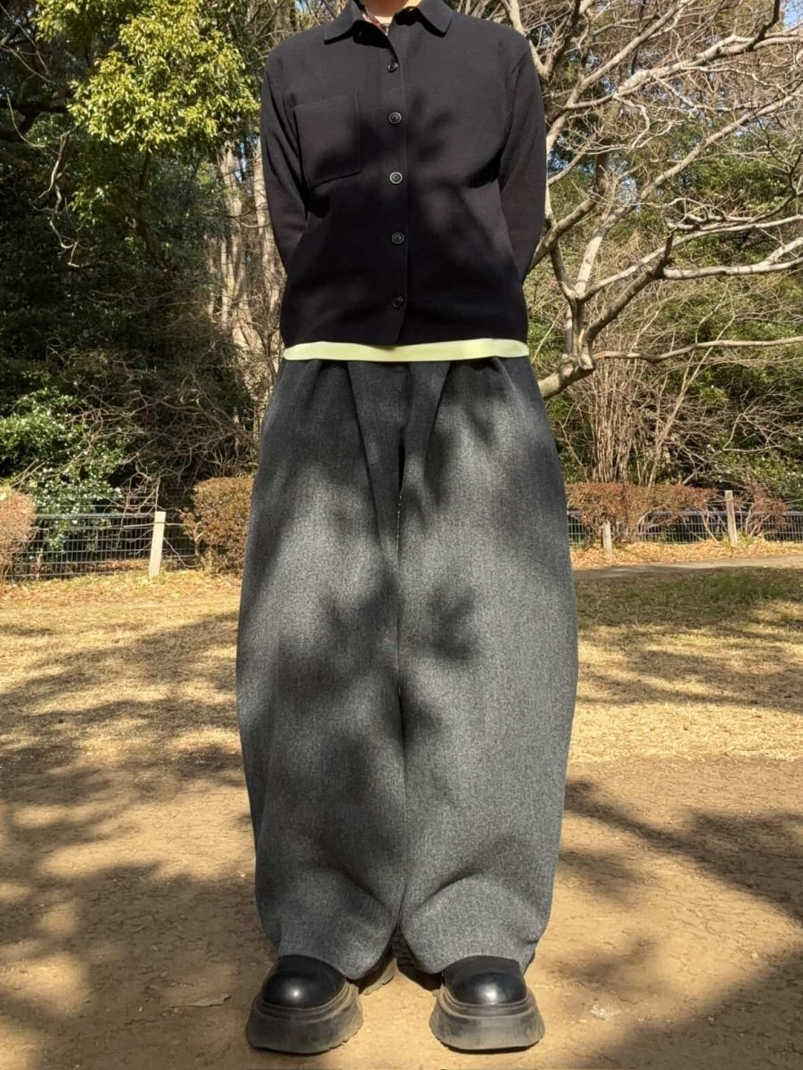 ウールライクな毛呢素材を使い、腰まわりに入れたタックで立体的な廓形を作った一本。太さはあるのに、落ち感がきれいだから野暮ったくならない。いわゆる“老钱风”の落ち着いた空気を、今のワイドシルエットに落とし込んだバランスです。