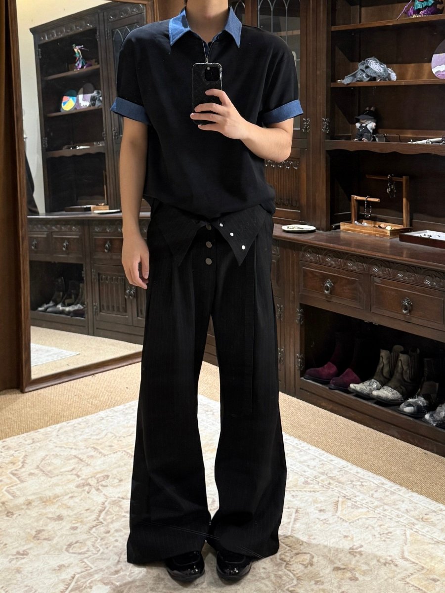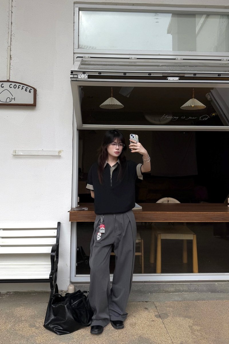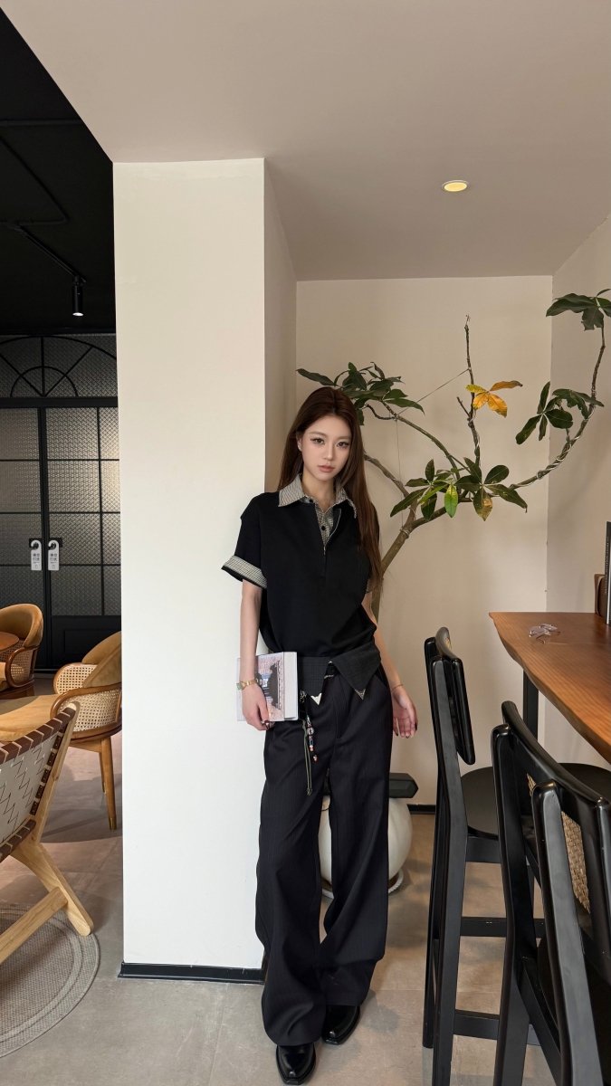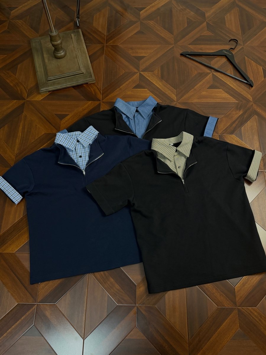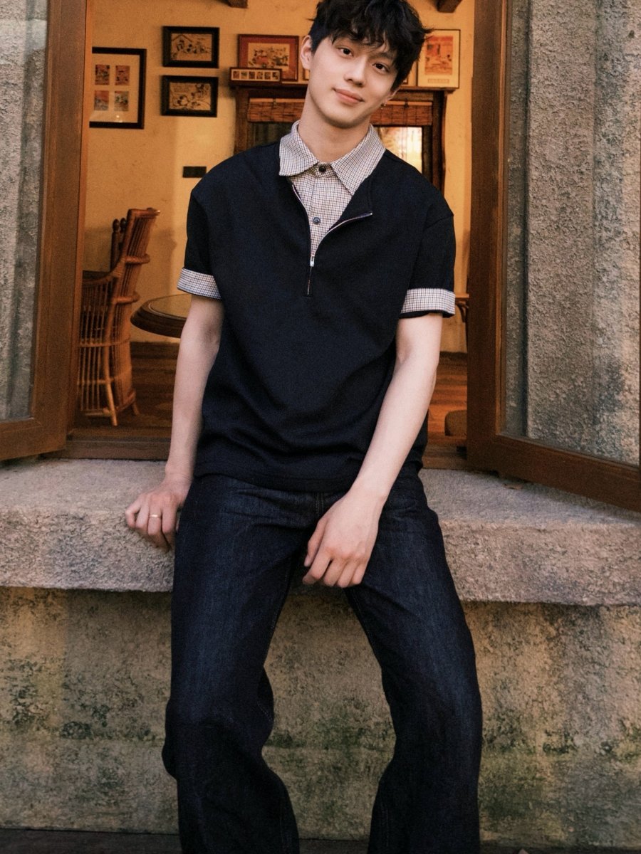 最大の特徴は、衿元に施された隠しジップデザイン。閉じた状態ではすっきりとしたポロシャツに見えながら、ジップを開くと千鳥格子またはチェック柄の内側が顔を出し、レイヤードしたような表情に変わります。袖口を折り返せばチェック柄が現れ、さらに異なるスタイリングを楽しめる遊び心も。