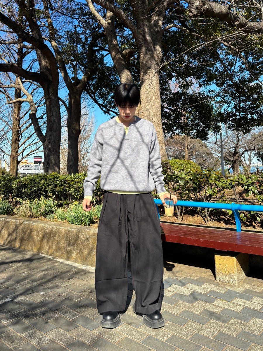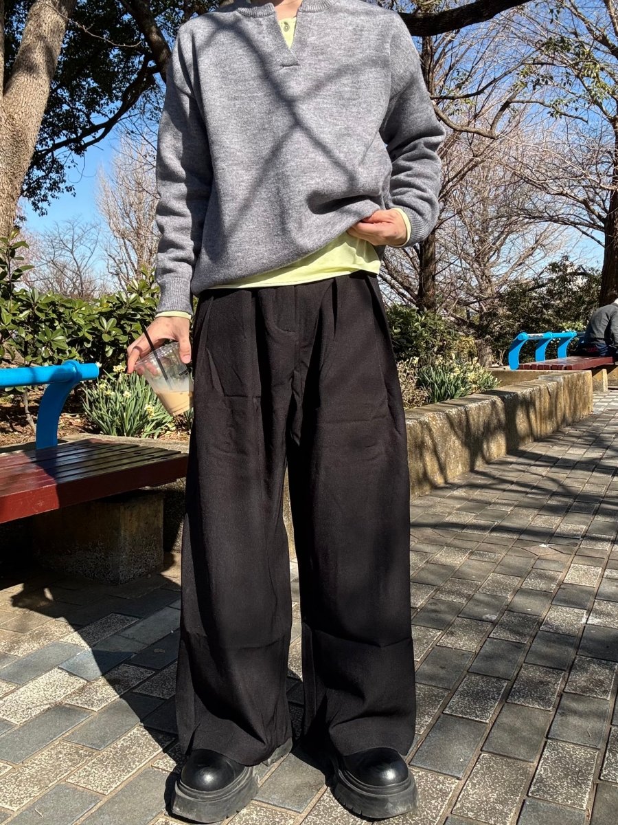 腰まわりに入ったタックと、裾までストンと落ちるワイドシルエット。動いたときに生まれる自然なドレープが、このパンツの一番の魅力です。いわゆるスラックスよりも力が抜けていて、デニムよりも品がある。そのちょうど中間のバランスが、今の気分にすごく合います。