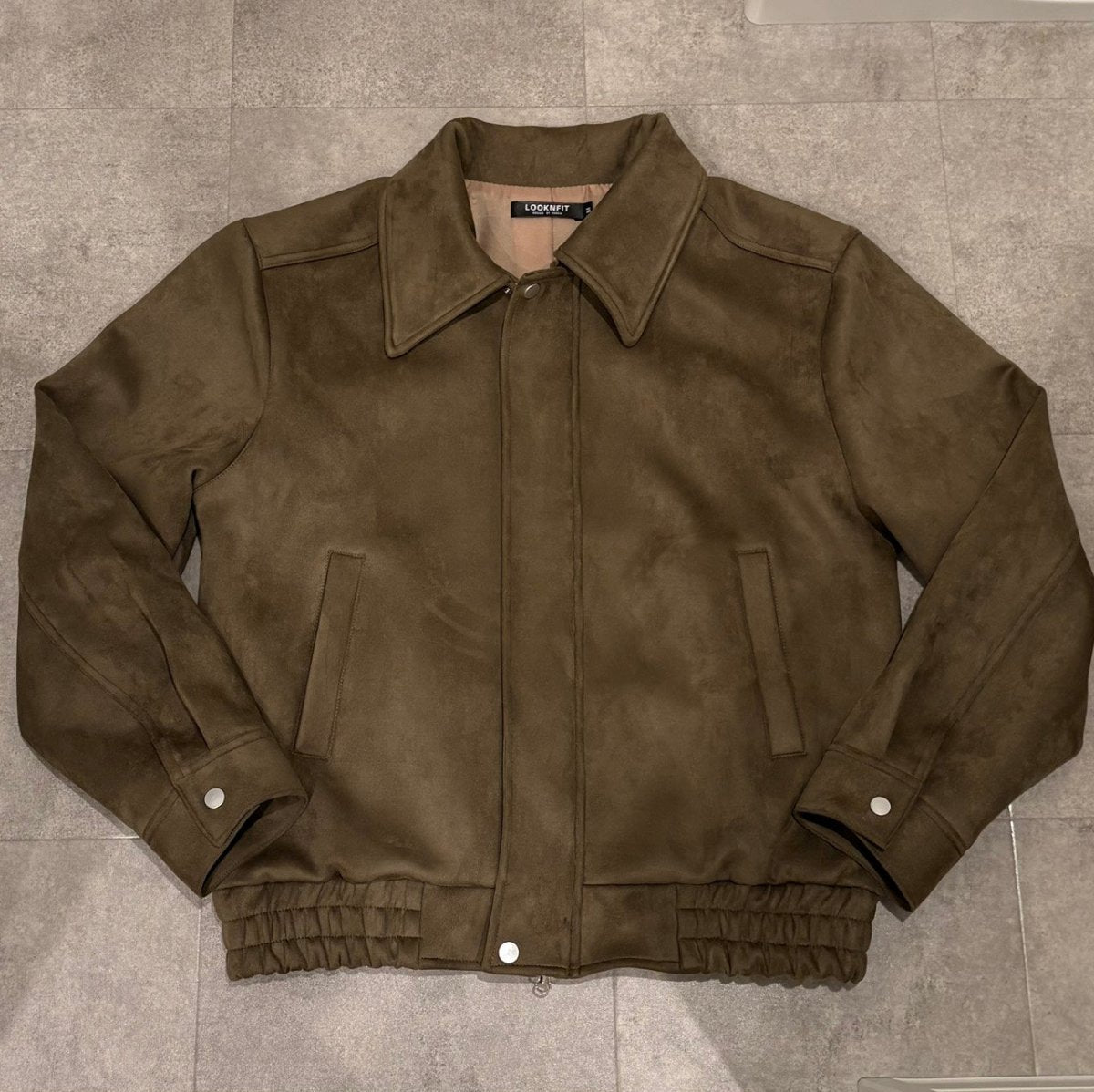 生地は柔らかく滑らかな麂皮風素材を使用していて、軽さがありながらもしっかり高級感のある表情。着たときの落ち感がきれいで、ラフに羽織るだけでもシルエットが整うのがポイントです。ダブルジップ仕様なので、開け方でシルエットの変化を楽しめるのも魅力。