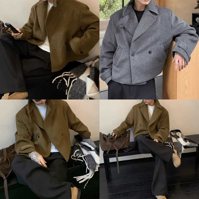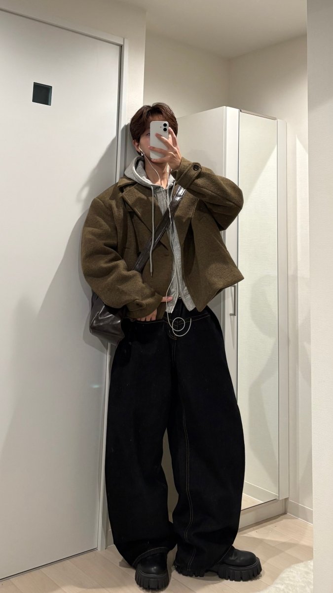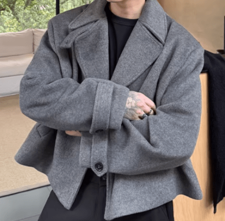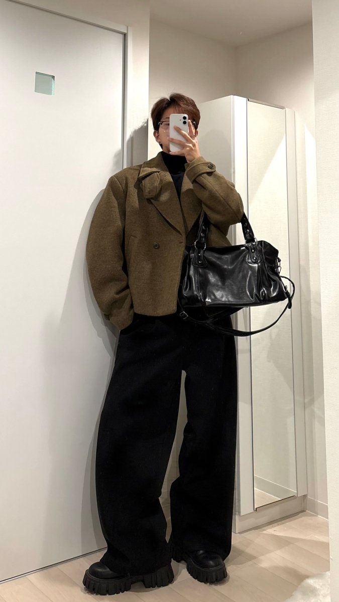 素材には上質感のあるウール調生地を使用。しっかりとした肉感がありながら、重たく見えず、構築的な廓形シルエットをきれいにキープしてくれます。短め丈なので重心が上がり、ワイドパンツやスラックスとも相性抜群。