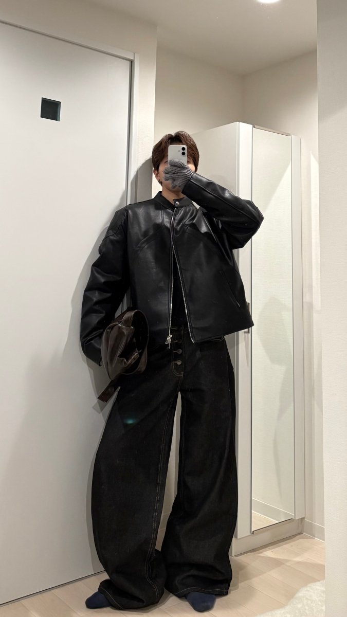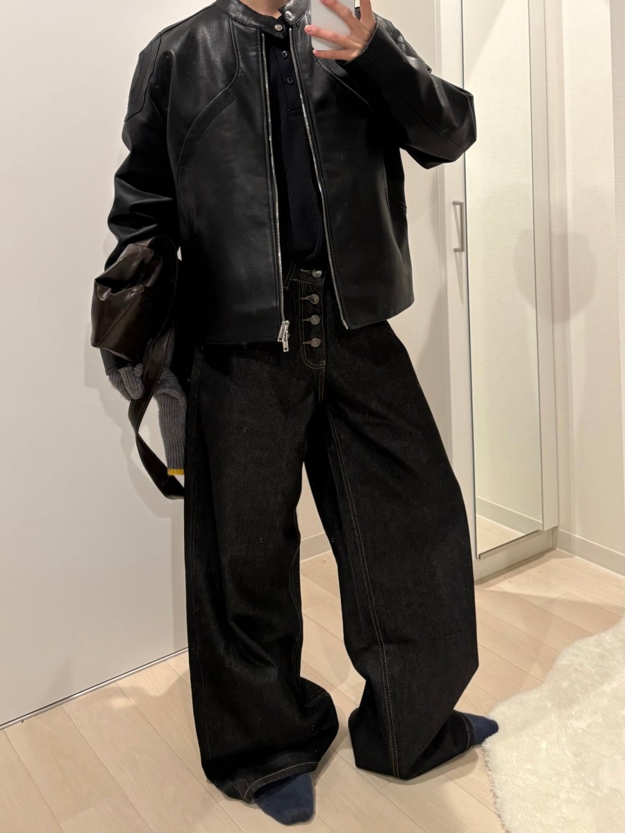 シルエットは今っぽいルーズフィット。インナーにニットやスウェットを合わせても余裕があり、長いシーズン活躍します。僕はワイドデニムと合わせて、少し力の抜けた“かっこいい”なスタイルで着るのがおすすめ。正直、クローゼットにあると頼りになる、大人のためのレザージャケットです。